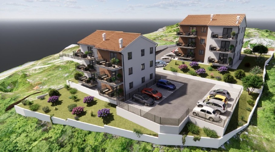 For sale is a two-bedroom apartment with a living room (S1), located on the ground floor of a modern residential building(B) in a peaceful area of Kosi, surrounded by greenery, offering a beautiful view of the Kvarner Bay.