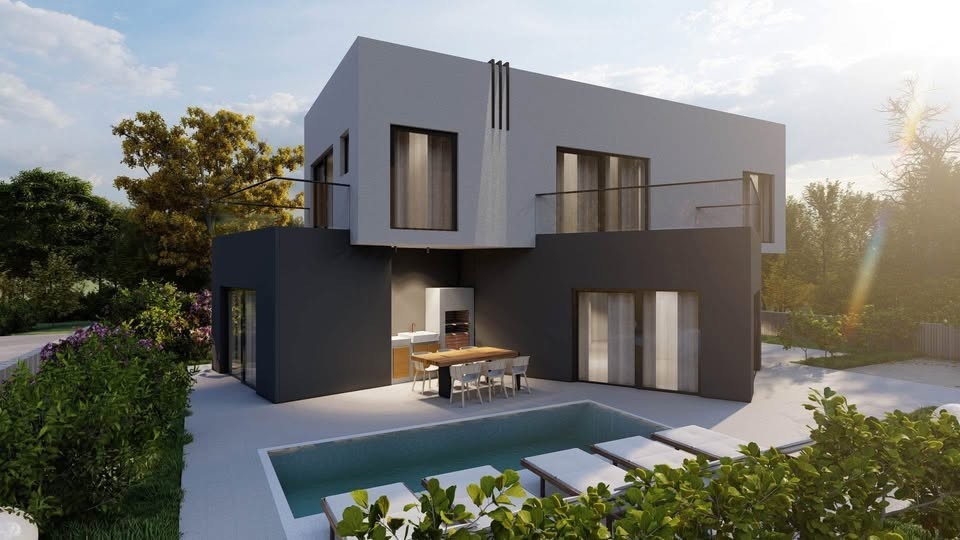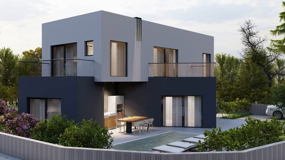 Parcela dolazi s gotovim projektom za obiteljsku kuću s bazenom, što omogućava brzu pripremu za početak gradnje.