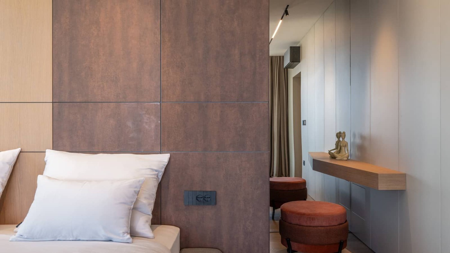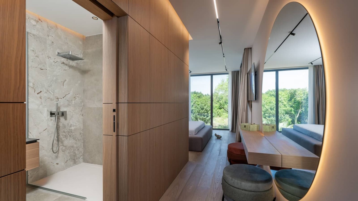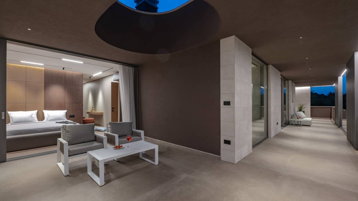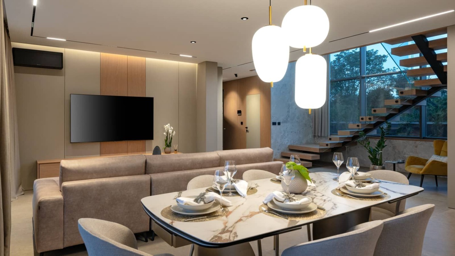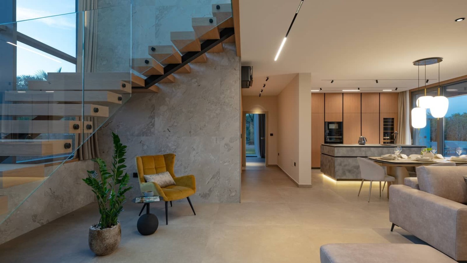 Cijeli interijer odiše suvremenim dizajnom s puno prirodnog svijetla, stvarajući toplu i ugodnu atmosferu.