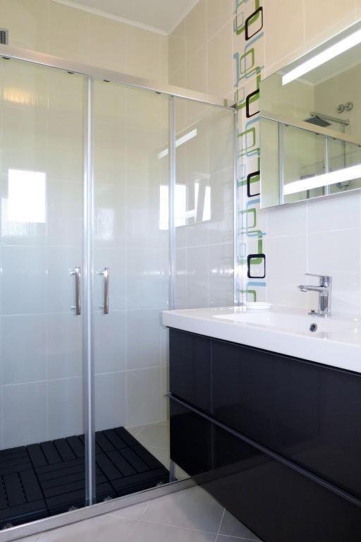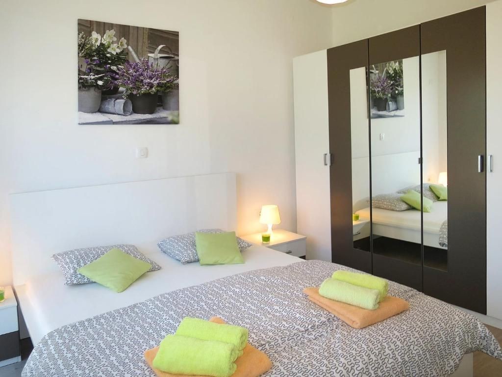 Prvi veći stan sastoji se kuhinje sa dnevnim boravkom i blagovaonom sa izlazom na terasu, jedne spavaće sobe i kupaone u prizemlju, te na katu još tri spavaće sobe sa kupaonama i terasom.