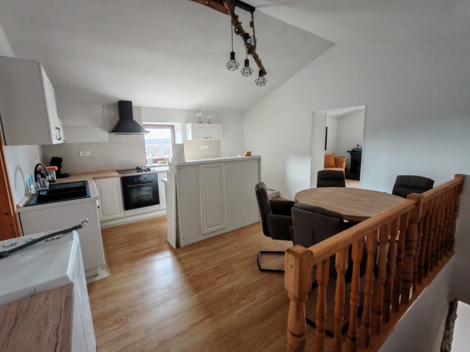 Na katu je prostrani i svijetli dnevni dio, kuhinja povezana sa blagovaonom, dnevni boravak, kupaona, te velika terasa.