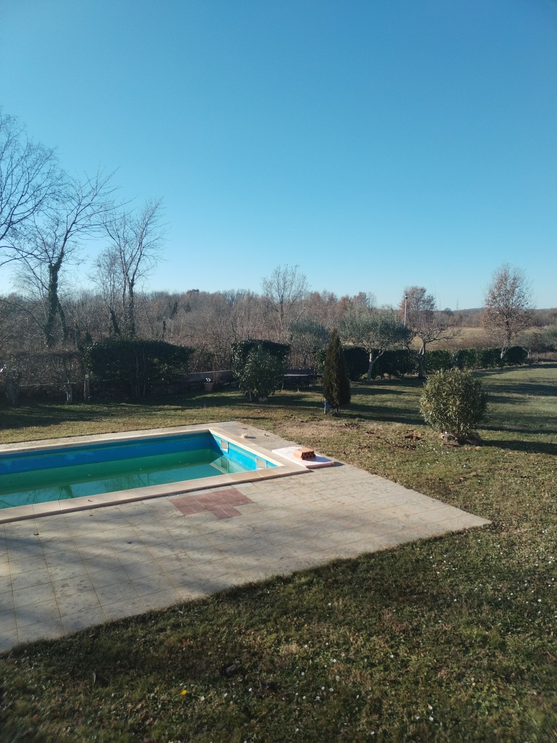 Na uređenoj okućnici smjestio se bazen sa sunčalištem, te velika natkrivena terasa.