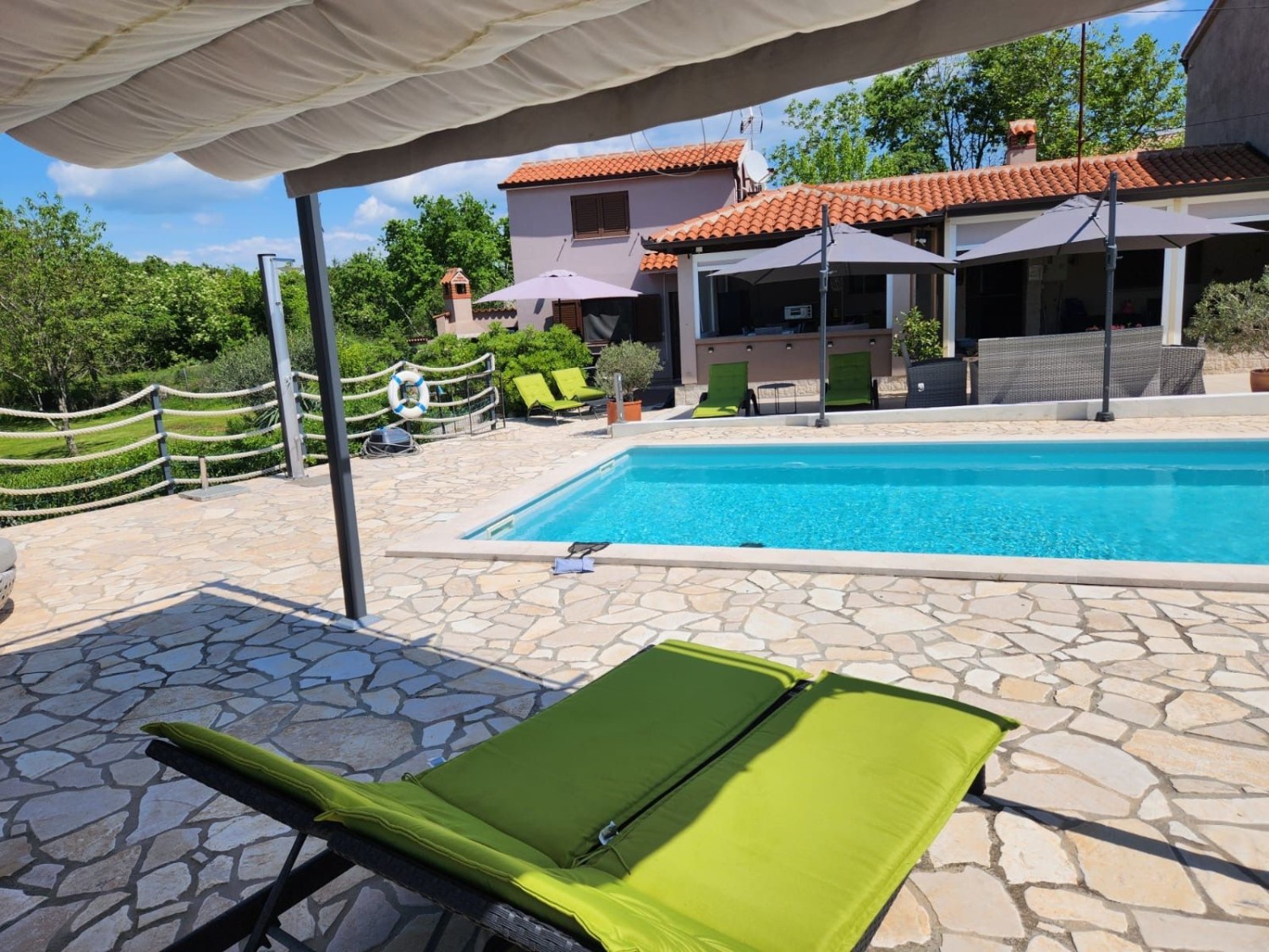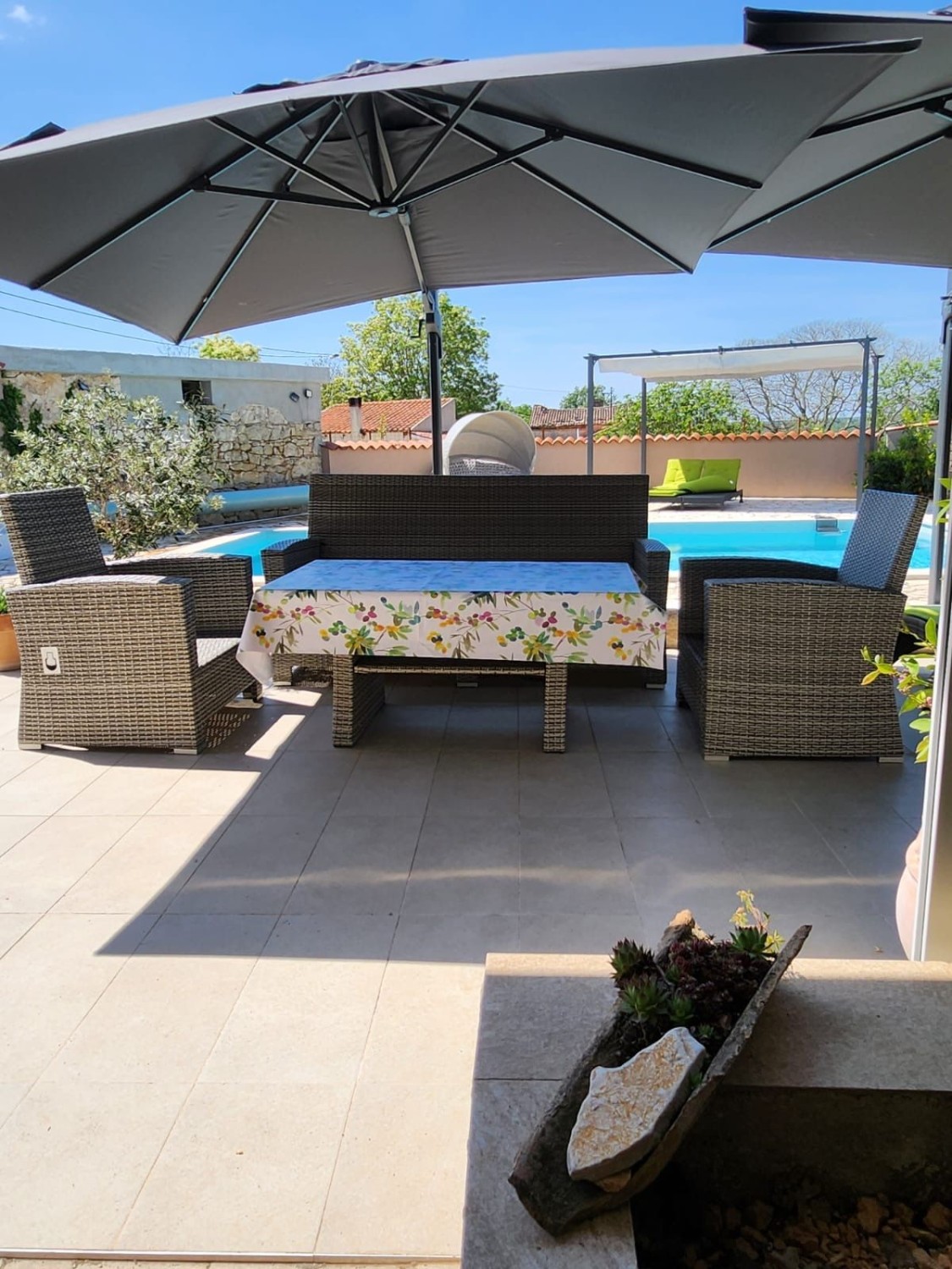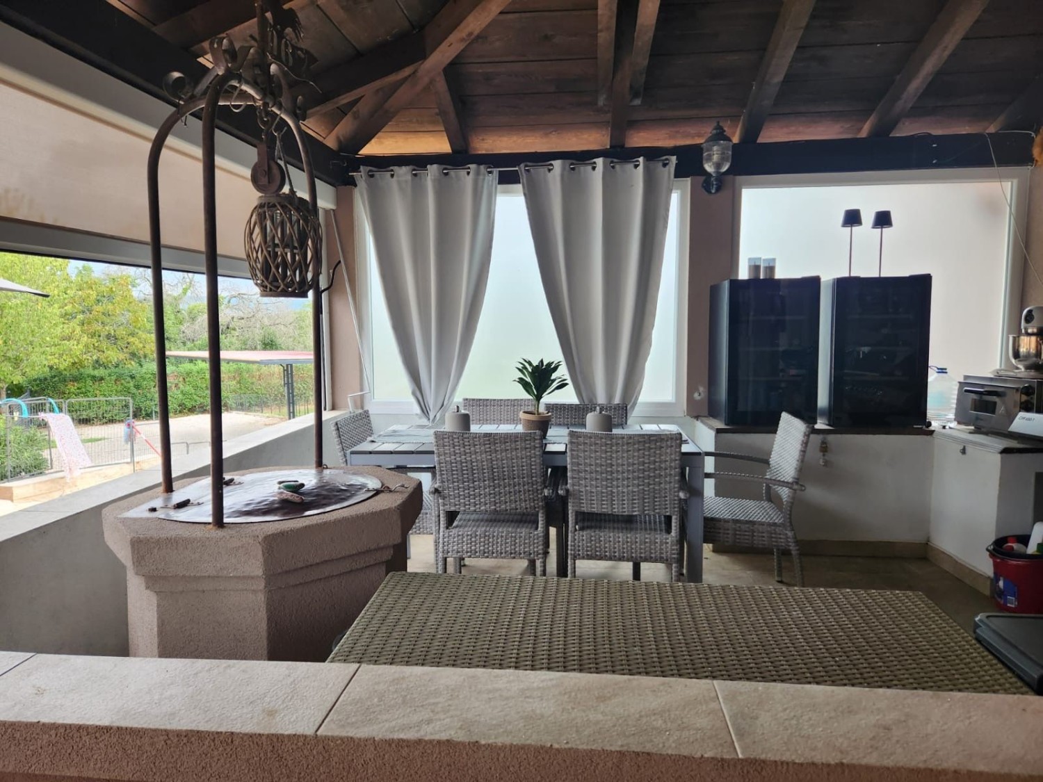 Iz kuće se izlazi na prekrasnu natkrivenu terasu, gdje se nalazi ljetna kuhinja sa roštiljem, jacuzzi i mono šta posebno daje šarm ovoj terasi istarska šterna.