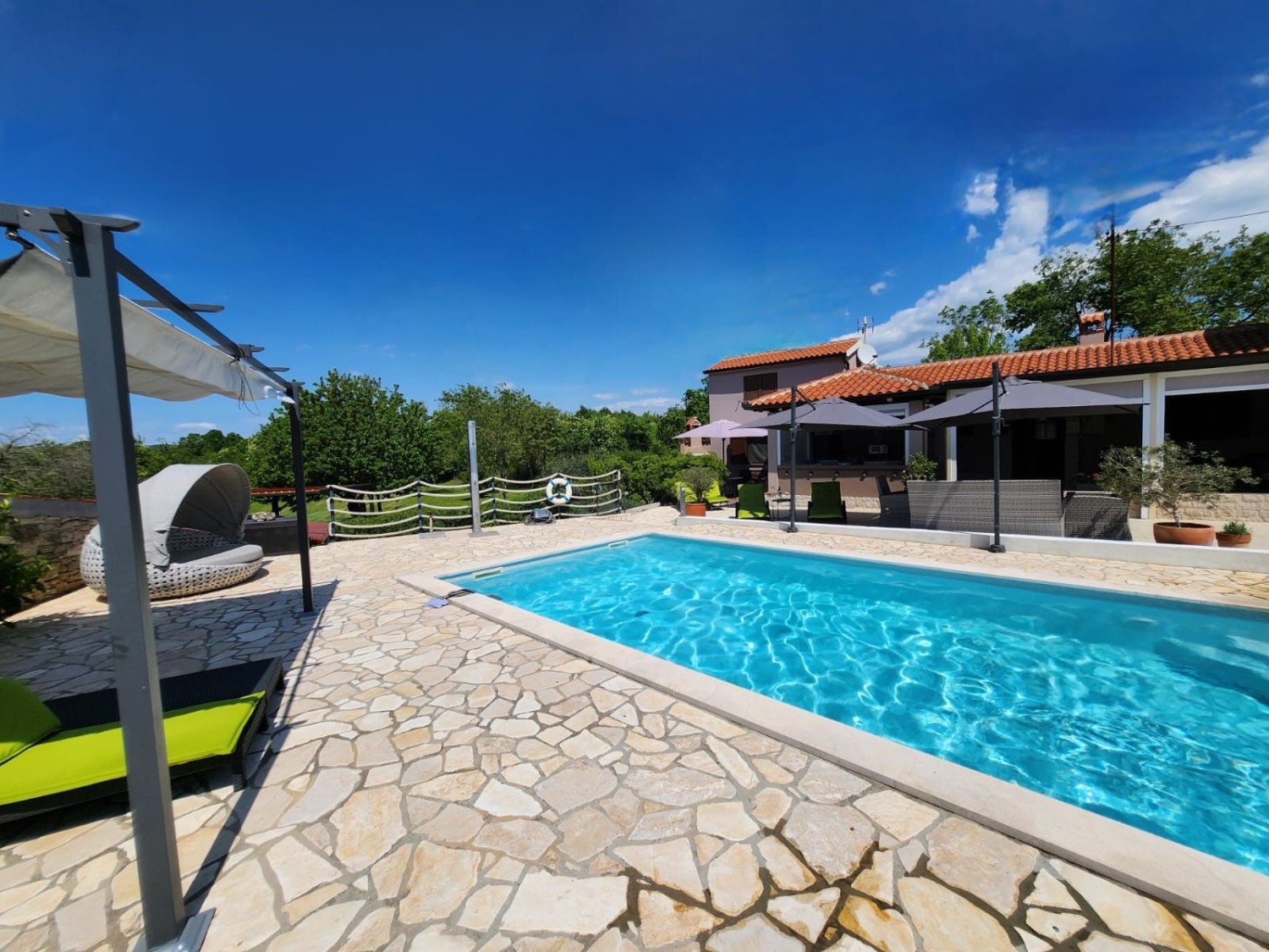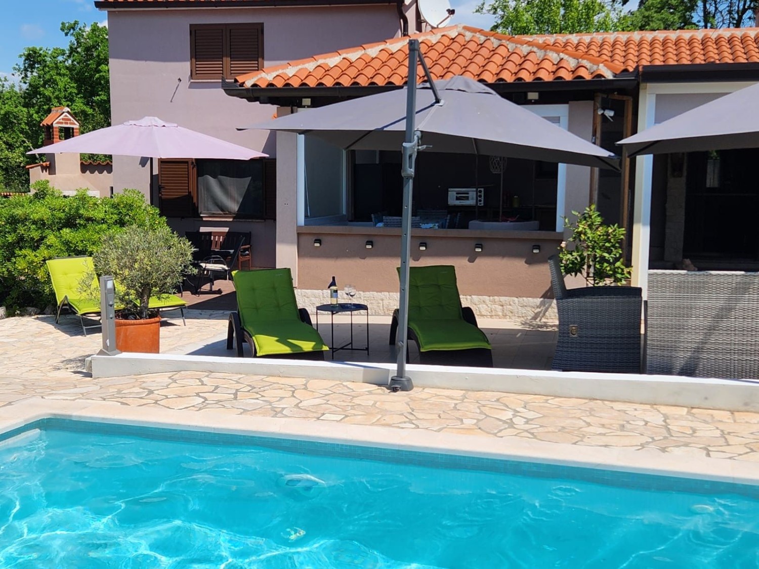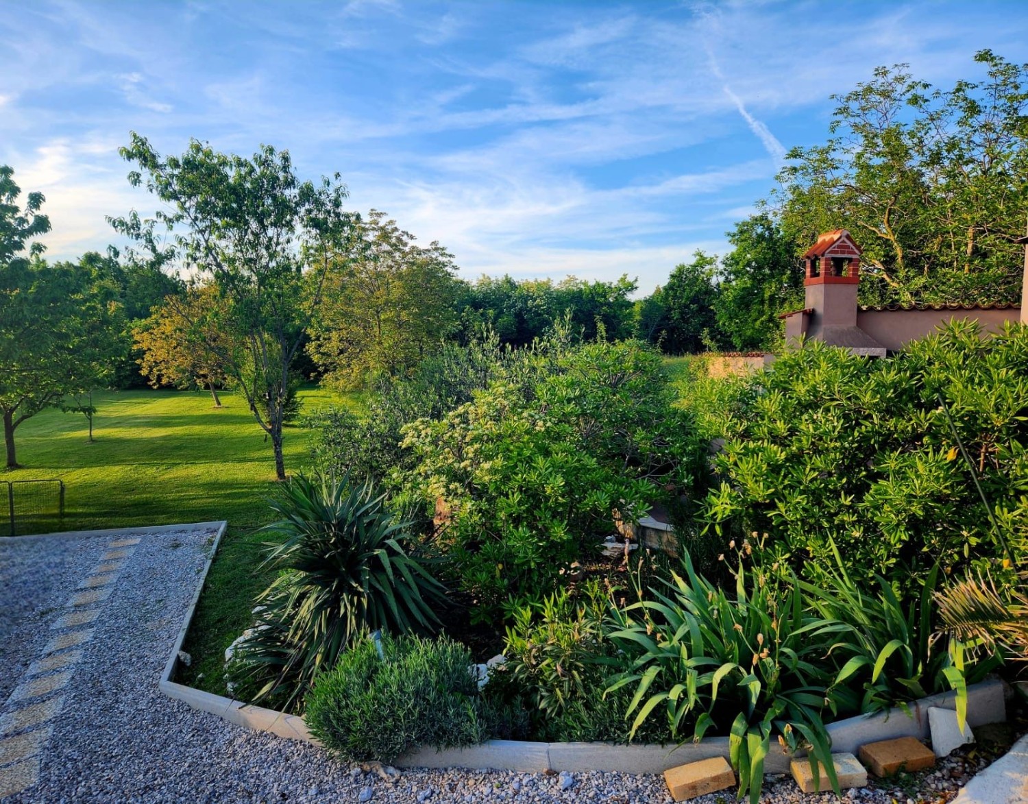 Iz kuće se izlazi na prekrasnu natkrivenu terasu, gdje se nalazi ljetna kuhinja sa roštiljem, jacuzzi i mono šta posebno daje šarm ovoj terasi istarska šterna.