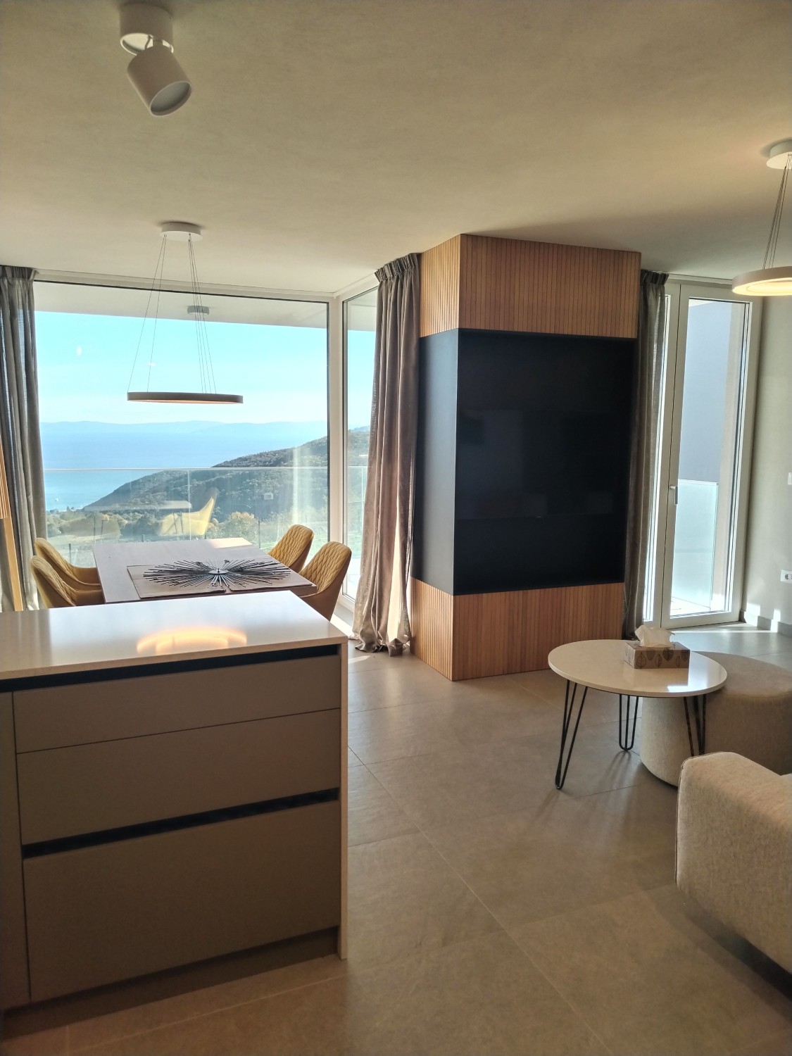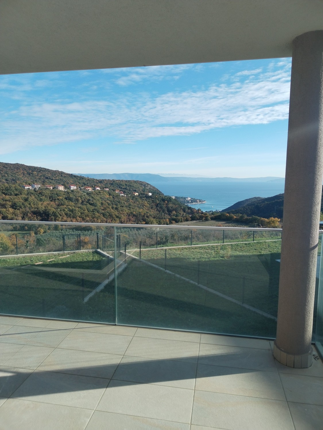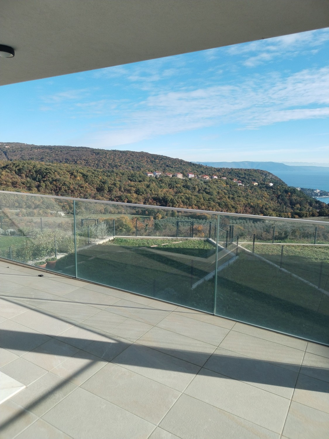 Iz dnevnog boravka izlazi se na na veliku natkrivenu terasu, sa koje se pruža nezaboravan pogled na more i Rabac.