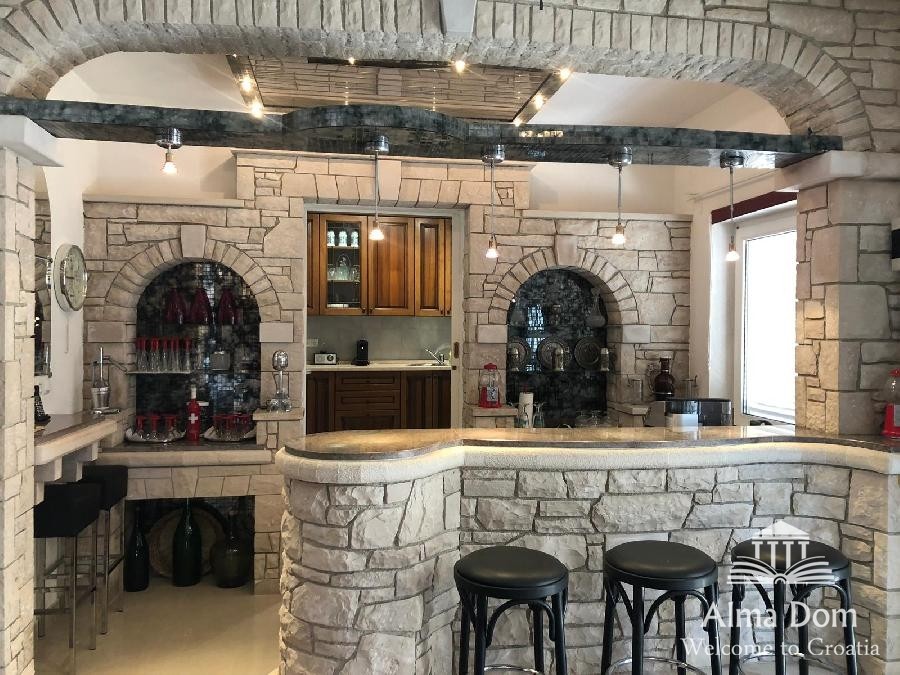 Prizemlje je raspoređeno na prostrani dnevni boravak koji se proteže na dvije cjeline, kuhinja + bar uređen od prirodnog kamena, prostorijama dominiraju volte, visoki stropovi, moderni kamin, uređen u kamenu.