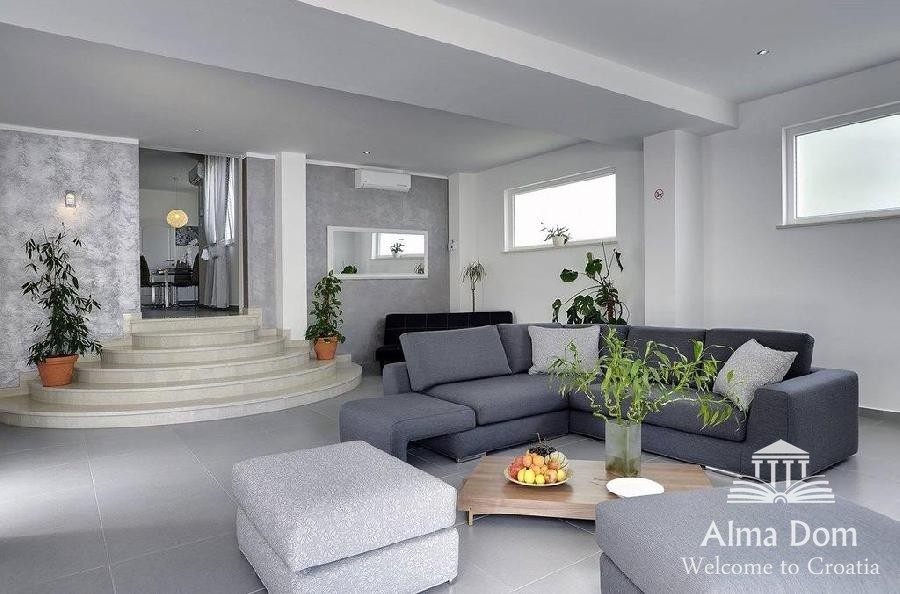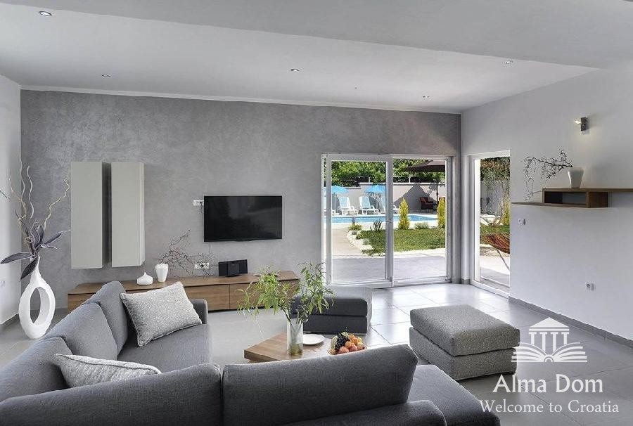 U prizemlju se nalazi ulazni hodnik s predprostorom, dvije spavaće sobe, dvije kupaonice, kuhinja s blagavaonicom i dnevnim velikim boravkom od 50 m2. Iz dnevnih prostorija izlaz je na terasu koja je natkrivena i ima cca 25 m2. Veliki bazen od 30 m2.