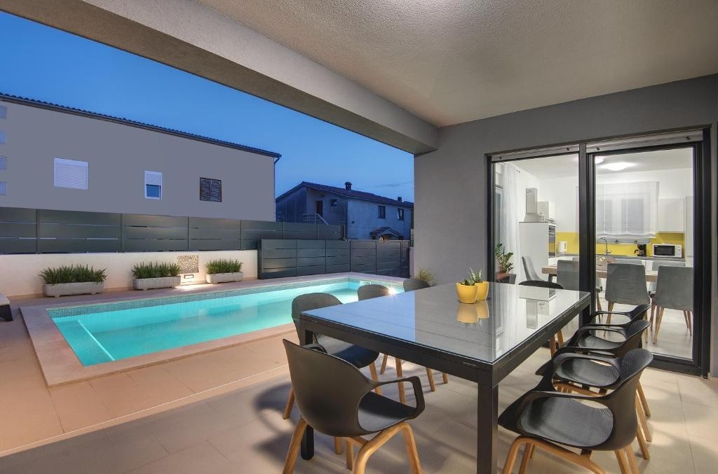 Sastoji se od prizemlja i kata. U prizemlju se nalazi ulazni hodnik, kupaonica, prostrani dnevni boravak te kuhinja s blagavaonciom. Iz dnevnog boravka se izlazi na prostranu terasu gdje se nalazi veliki stol te ljetna kuhinja, te vrt gdje se nalazi sunčakište te bazen veličine 4 x 8 metara. Na katu kuće se nalaze 3 spavaće sobe s kupaonicama.
