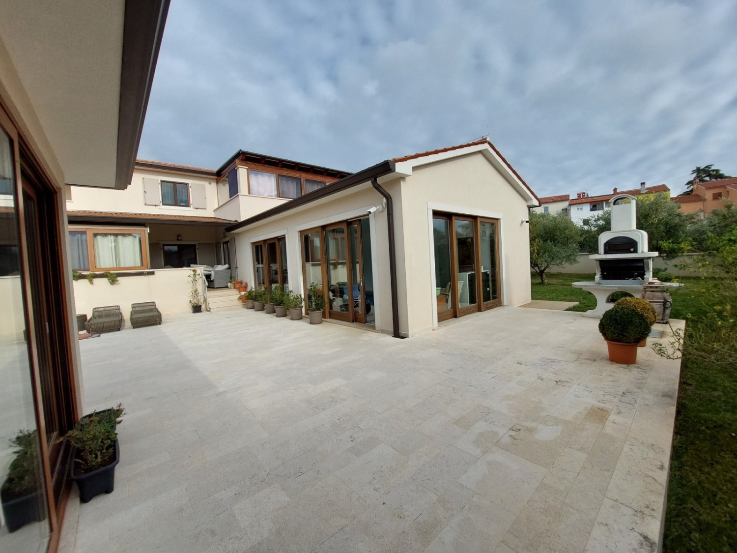 Prodaje se prekrasna kuća u Vodnjanu sa dva stana i unutarnjim bazenom. Zemljište na kojem je kuća napravljena veličine je 1683m2. Kuća se sastoji od podruma, prizemlja i prvog kata. Kuća je velika 489m2. Na prvom katu nalaze se dva stana te svaki stan ima svoj zaseban ulaz. Prvi stan je dvoetažni te se na prvoj etaži nalazi blagavaonica, kuhinja sa dnevnim boravkom i blagavaonicom, gardaroba te toalet za goste. Drugoj etaži se pristupa preko unutarnjeg stepeništa koje vodi na drugi kat kuće gdje se nalaze tri spavaće sobe sa vlastitim kupatilom. Također sa drugog kata se izlazi na prostranu terasu koja je dijelom natkrivena i nenatkrivena drugim dijelom. Stan koji se nalazi u prizemlju je jednoetažni te je veličine 43m2. Jednoetažni stan se sastoji od dnevnog boravka sa kuhinjom, blagovaonicom, spavaćom sobom i jednim kupatilom. Unutarnji bazen je veličine 18m2 odnosno dimenzija 6x3. također u kući se nalaze dvije velike zatvorene terase i moderna ljetna kuhinja. Kuća se nalazi na sređenoj, zatvorenoj okućnici. U svakoj sobi se nalaze klima uređaji te je kuća skroz klimatizirana. Kuća se prodaje potpuno namještena. Kuća se nalazi nekoliko stotina metara od glavnog gradskog traga, trgovina i svih bitnih sadržaja ali je opet u dijelu Vodnjana koji je miran te nema previše prometa. Kuća se nalazi 6 minuta vožnje autoilom do prve plaže te se nalazi 12 minuta do Pule. Kuće se može baviti turizmom i iznajmljivanjem te je pogodna za ugodan i dug boravak.