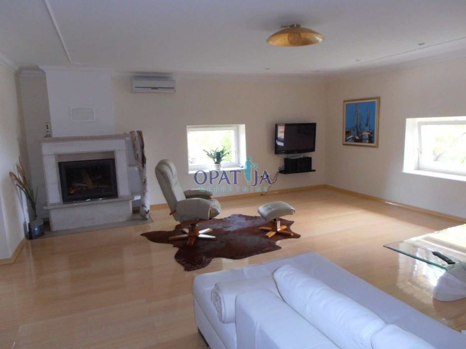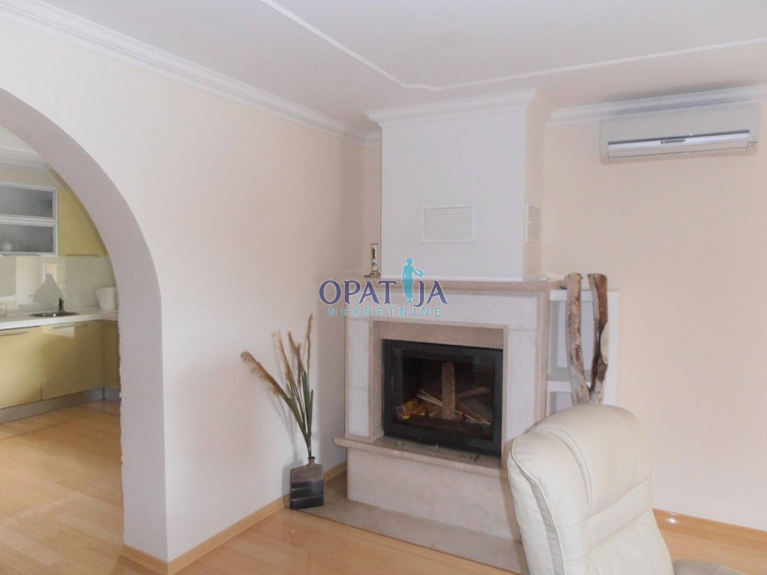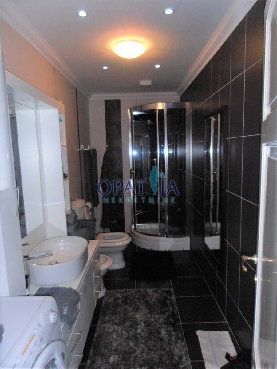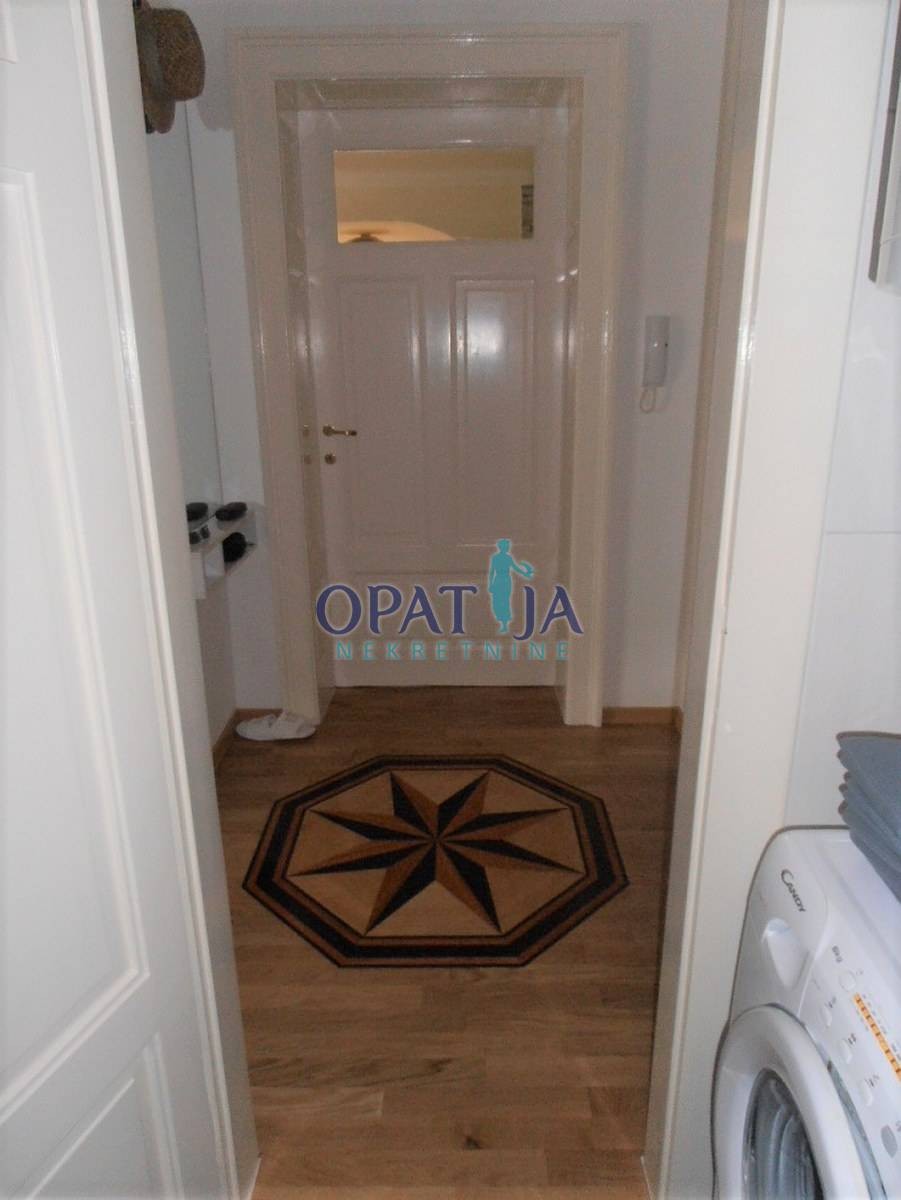 U povijesnoj opatijskoj vili izgrađenoj 1891 god. na predzadnjoj etaži, 2. kat, u ponudi je adaptirani stan površine 123 m2: predsoblje, veliki dnevni boravak od 38 m2, s kaminom na kruta goriva, pogled na more, moderna kuhinja s blagavaonom, površine 24 m2, klimatizirano, dvije spavaće sobe, dvije kupaone, u suterenu spremište od