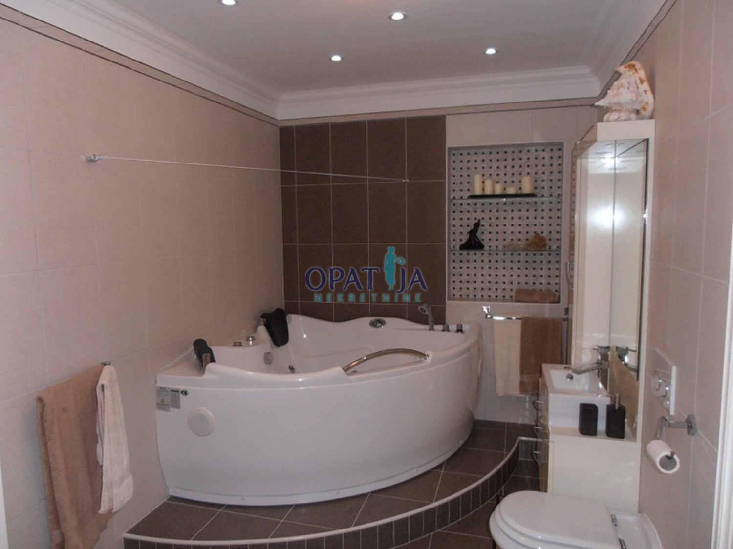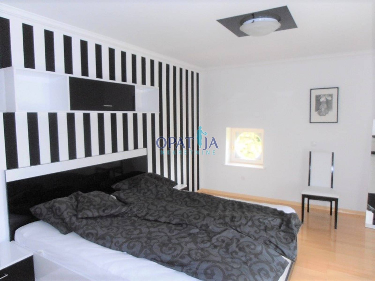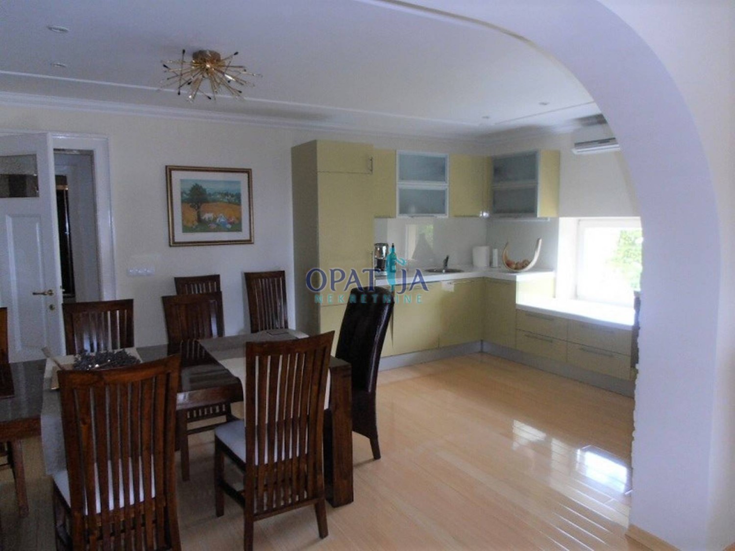 U povijesnoj opatijskoj vili izgrađenoj 1891 god. na predzadnjoj etaži, 2. kat, u ponudi je adaptirani stan površine 123 m2: predsoblje, veliki dnevni boravak od 38 m2, s kaminom na kruta goriva, pogled na more, moderna kuhinja s blagavaonom, površine 24 m2, klimatizirano, dvije spavaće sobe, dvije kupaone, u suterenu spremište od