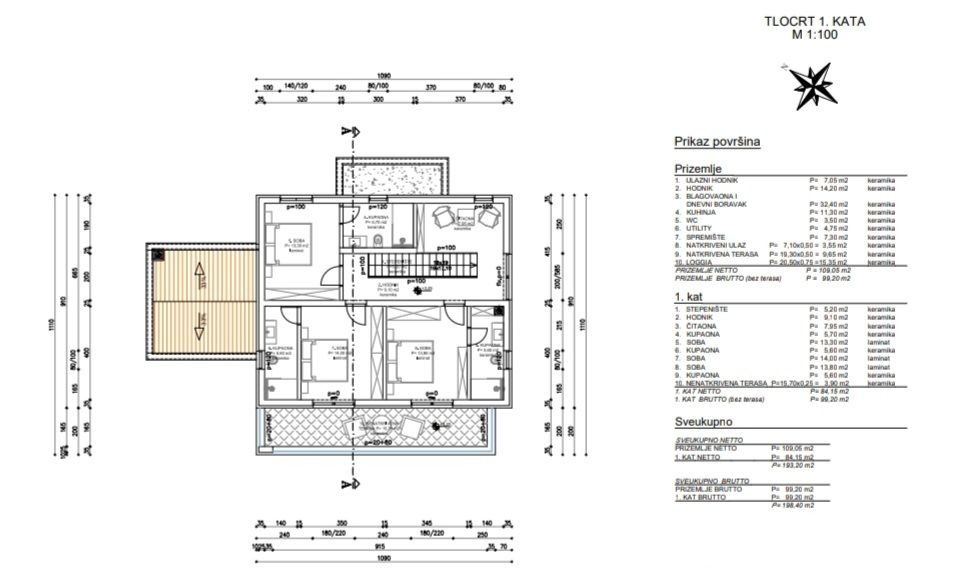 - prizemlje se sastoji od natkrivenog ulaza te ulaznog hola,spremišta,utility sobe,wc,