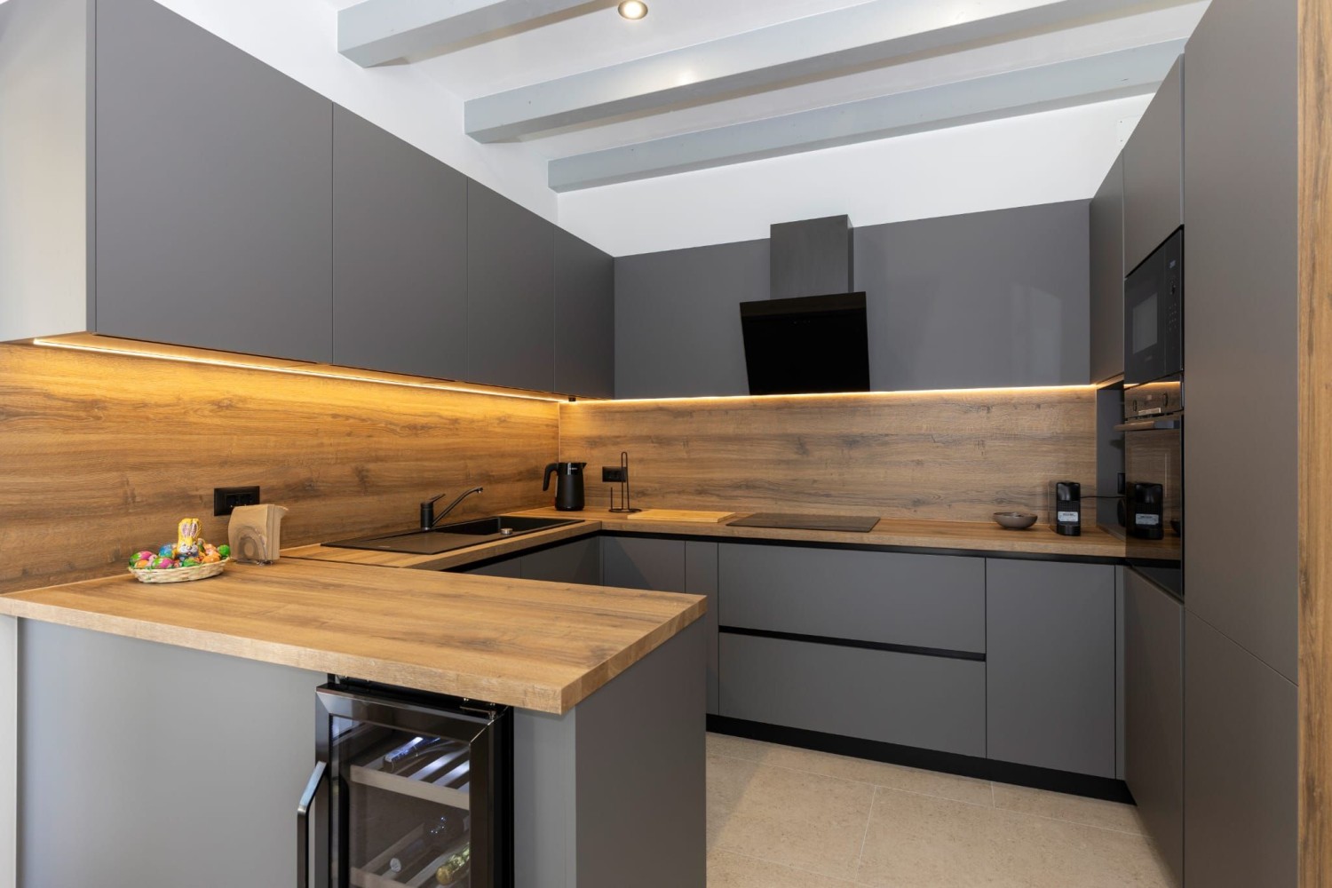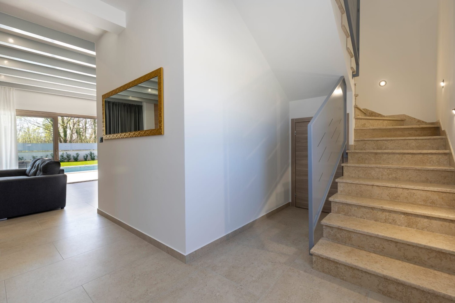 Prizemlje se sastoji od otvorenog koncepta koji ujedinjuje dnevni boravak, blagovaonicu i kuhinju s izlazom na natkrivenu terasu sa ljetnom kuhinjom