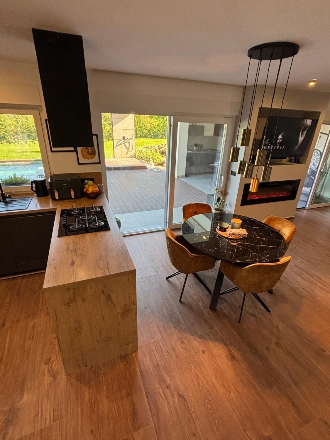 Velike staklene stijene pružaju pogled na elegantnu terasu sa sunčalištem i bazenom te na uređen prostran travnjak i zelenilo koji okružuju ovu Vilu.