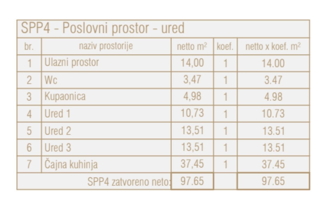 Poslovni prostor SPP4, nalazi se u prizemlju sjevernog dijela i sastoji se od ulaznog prostora, kupaone,WC, 3 ureda i čajne kuhinje.