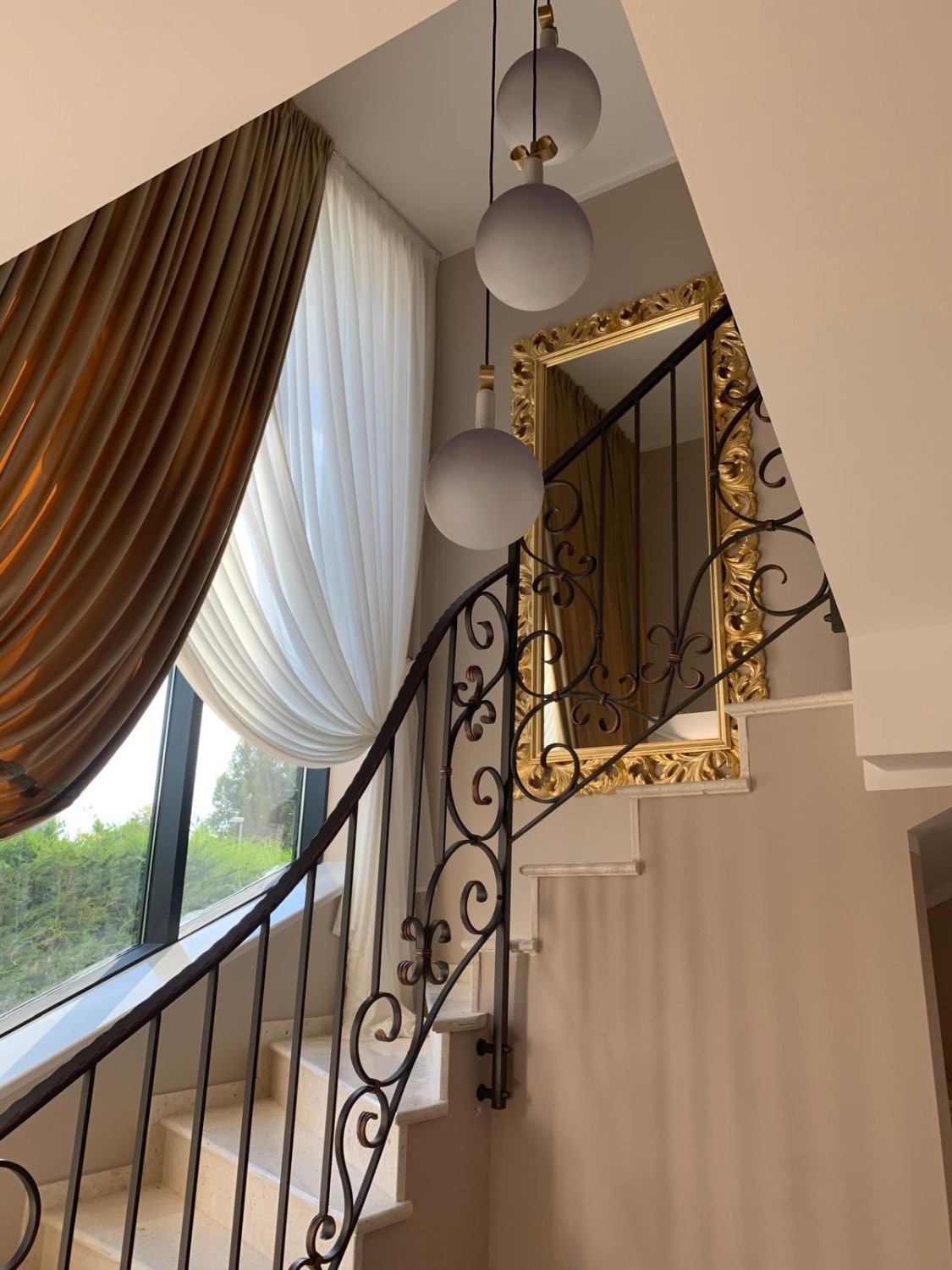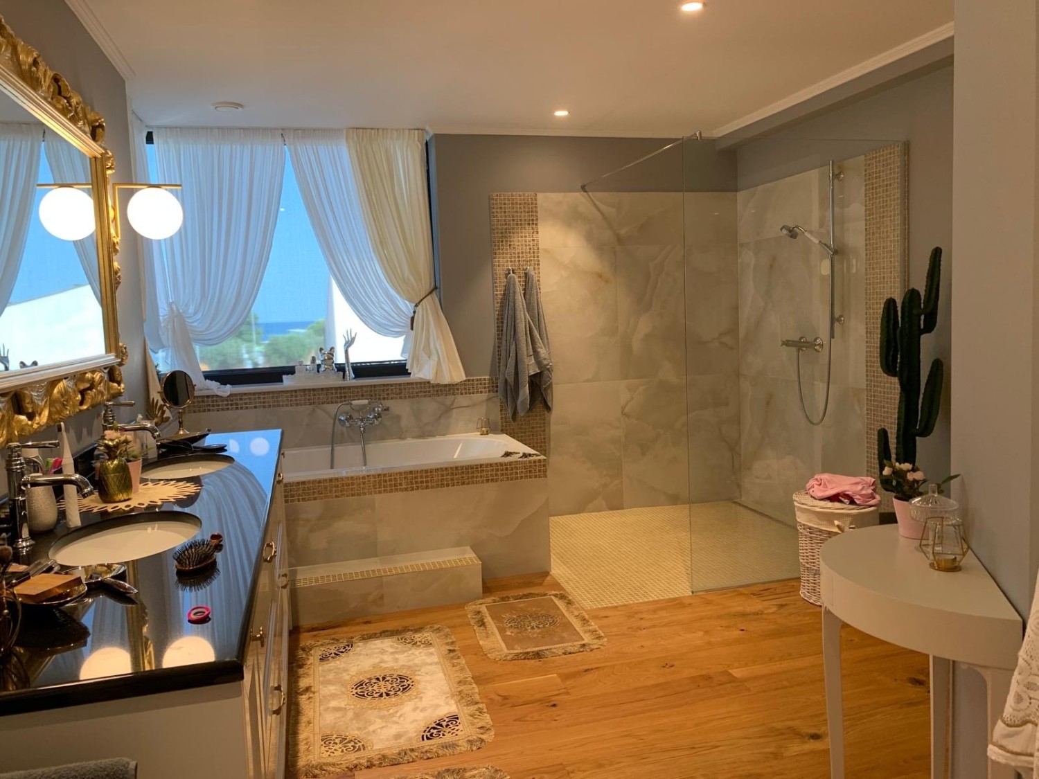 Elegantne stepenice vode na kat gdje se nalazi masterspavaća soba s galerijom na kpjoj je dnevni boravak i manja kuhinja te prostranom kupaonicom s tušem i kadom s pogledom na more, terasa s prekrasnim pogledom na