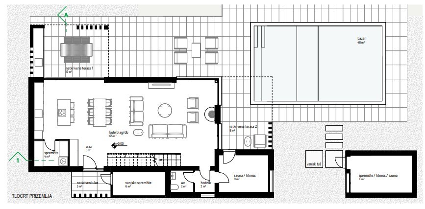 Prizemlje se sastoji od modernog dnevnog dijela sa open space konceptom kuhinje, blagovaone i dnevnog boravka koji doprinosi skladu i funkcionalnosti. u prizemlju se također nalazi i spremište (unutarnje i vanjsko), prostorija za saunu/fitness te prijelaz na 2 natkrivene terase. U vanjskom prostoru, osim navedenih natkrivenih terasa i