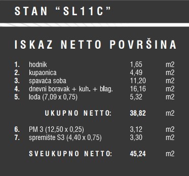 Stan oznake 11C nalazi se na 1.katu zgrade i sastoji se od: hodnika, dnevnog boravka s kuhinjom i blagovaonom, spavaće sobe, kupaone i lođe.