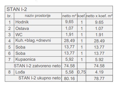 Stan I-2, nalazi se na 1. katu zgrade, ukupne kvadrature 80.16 m2 (netto 78,77 m2), a sastoji se od: hodnika, kuhinje, dnevnog boravka i blagovaonice, ostave, 2 spavaće sobe, toaleta, kupaonice i lođe. Grijanje/hlađenje stana će biti osigurano uz klima uređaje Mitsubishi i podno grijanje.