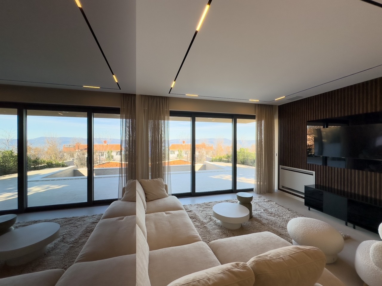 Vila se nalazi u malom selu nedaleko od Labina, građena je 2023. godine, te je opremljena dizajnerskim namještajem i opremom.