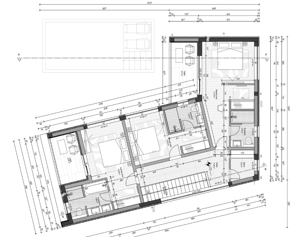 Kat (površine 97,09 m2, neto 93,26 m2) se sastoji od: hodnika, ostave, 3 spavaće sobe, 3 kupaonice i 2 loggia-e.