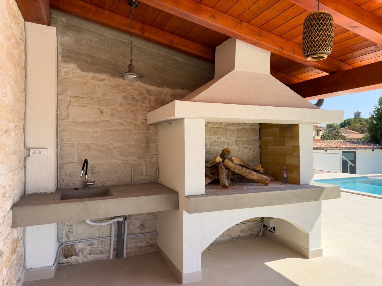 Uz bazen koji je grijan nalazi se velika natkrivena terasa sa zidanim roštiljem, strujom i vodom.