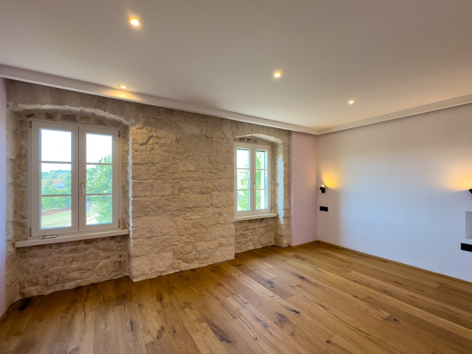 Prizemlje se sastoji od dvije spavaće sobe (svaka sa svojom kupaonicom), prostranog dnevnog boravka sa kaminom, kuhinjom i blagovaonicom, te još jednom prostorijom koja može biti ured.