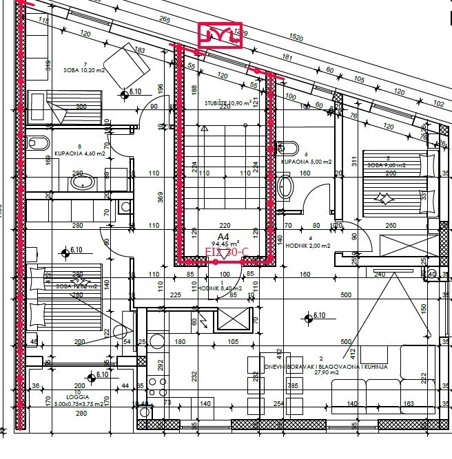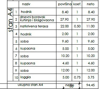 Stan A4, površine 94,45 m2, nalazi se na 2 katu zgrade te sastoji se od: