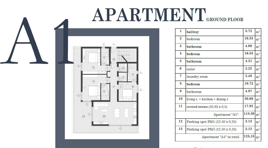 Stan oznake A1 nalazi se u prizemlju zgrade A i sastoji se od: hodnika, dnevnog boravka s kuhinjom i blagovaonom, 3 spavaće sobe, 3 kupaone, WC-a i terase.