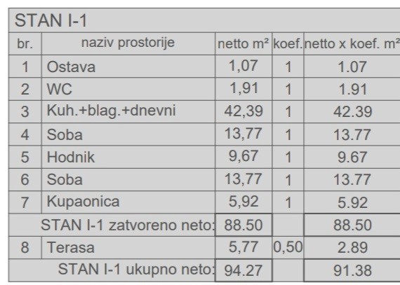 L'appartamento l1, si trova al 1° piano dell'edificio, metratura totale 91,38 mq, ed è composto da: corridoio, cucina, soggiorno e sala da pranzo, dispensa, 2 camere da letto, wc, bagno e terrazzo. Il riscaldamento/raffreddamento dell'appartamento sarà fornito con condizionatori Mitsubishi e riscaldamento a pavimento.