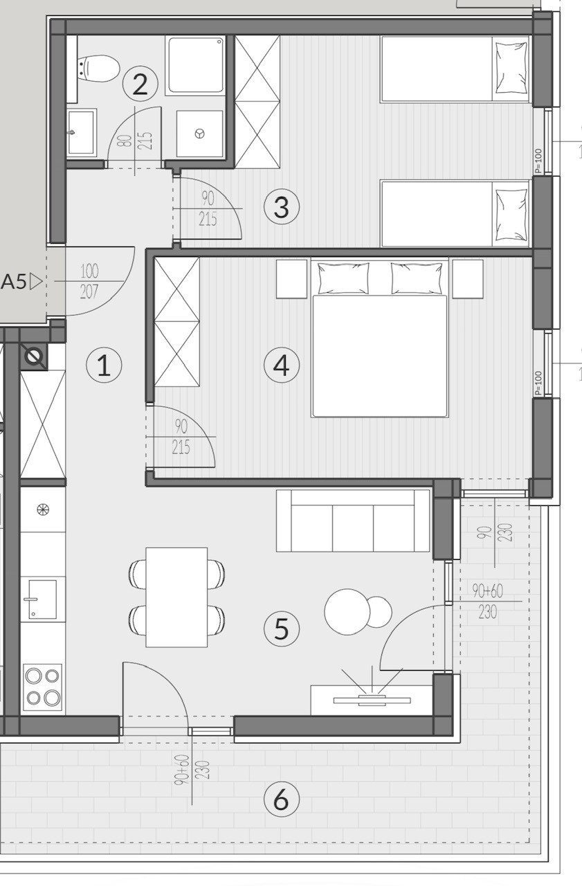 L'appartamento A5 si trova al piano terra dell'edificio ed è composto da: corridoio+armadio, soggiorno con cucina e sala da pranzo, 2 camere da letto, bagno e terrazzo coperto. L'appartamento dispone di due posti auto di 13,12 mq.