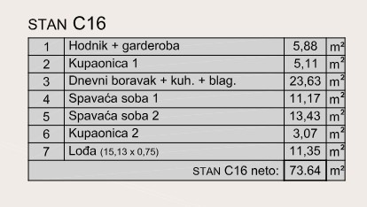 L'appartamento C16, con una superficie di 73,64 m2, si trova nell'edificio C.