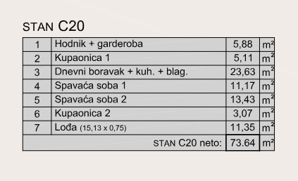L'appartamento C20, con una superficie di 73,64 m2, si trova nell'edificio C.