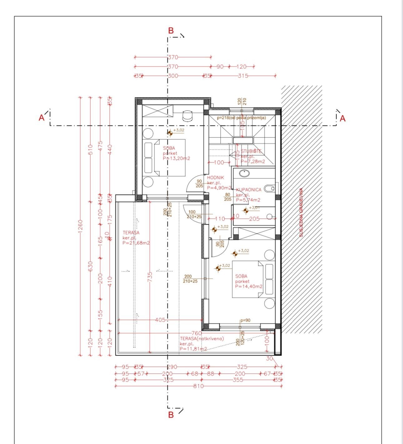 Primo piano: due camere da letto, bagno, ampia terrazza aperta di 20 m².