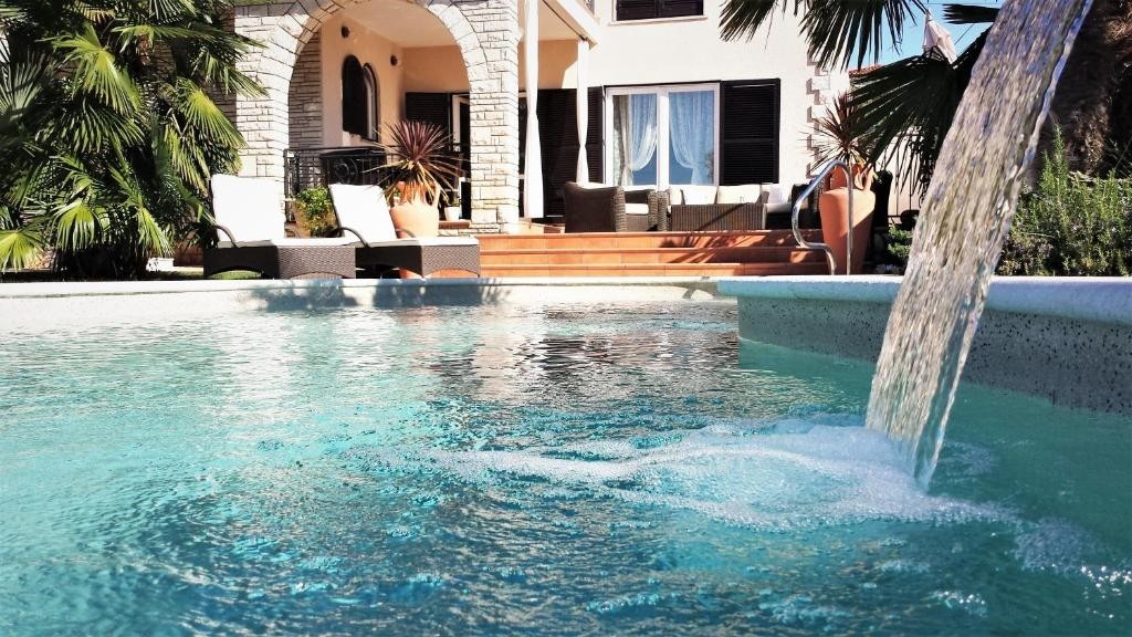 La piscina è a forma libera, della superficie di 28 mq, dotata di cascata idromassaggio, illuminazione notturna, coperture estive ed invernali e robot per la pulizia automatica della piscina.