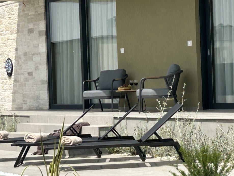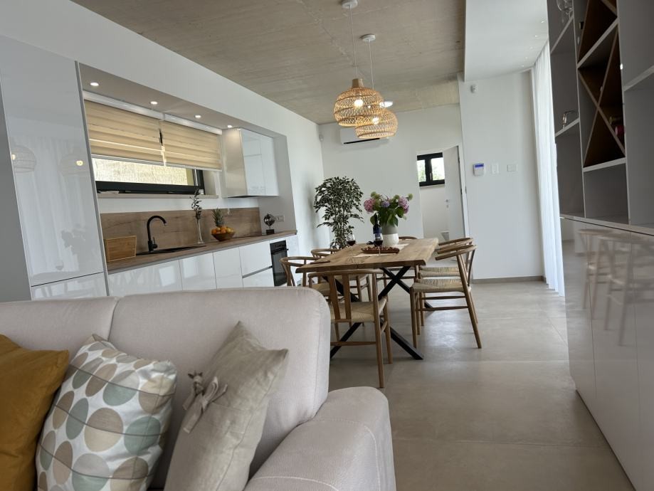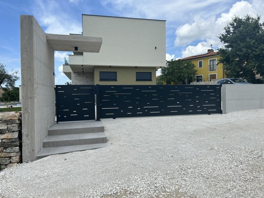 È in vendita una moderna casa con piscina esposta a sud-ovest, ai margini del villaggio (ultimo lotto urbanizzato). L’inizio dei lavori è previsto nell’autunno del 2022 e il completamento nel 2023. L'abitazione è composta da soggiorno con cucina e sala da pranzo, wc, ripostiglio, locale caldaia e terrazzo coperto, oltre ad un fabbricato ausiliario con camino al piano terra. Al piano superiore tre camere da letto con bagno e balcone. La casa sarà riscaldata e raffrescata con condizionatori inverter, infissi in plastica, piastrelle in ceramica, parquet nelle camere, piastrelle in piscina. La prima fase del riscaldamento centralizzato a pavimento e collettori. Nel cortile piscina di 40 mq, prato con irrigazione automatica, parcheggio per due auto, porta del cortile con apertura automatica, recinzione.