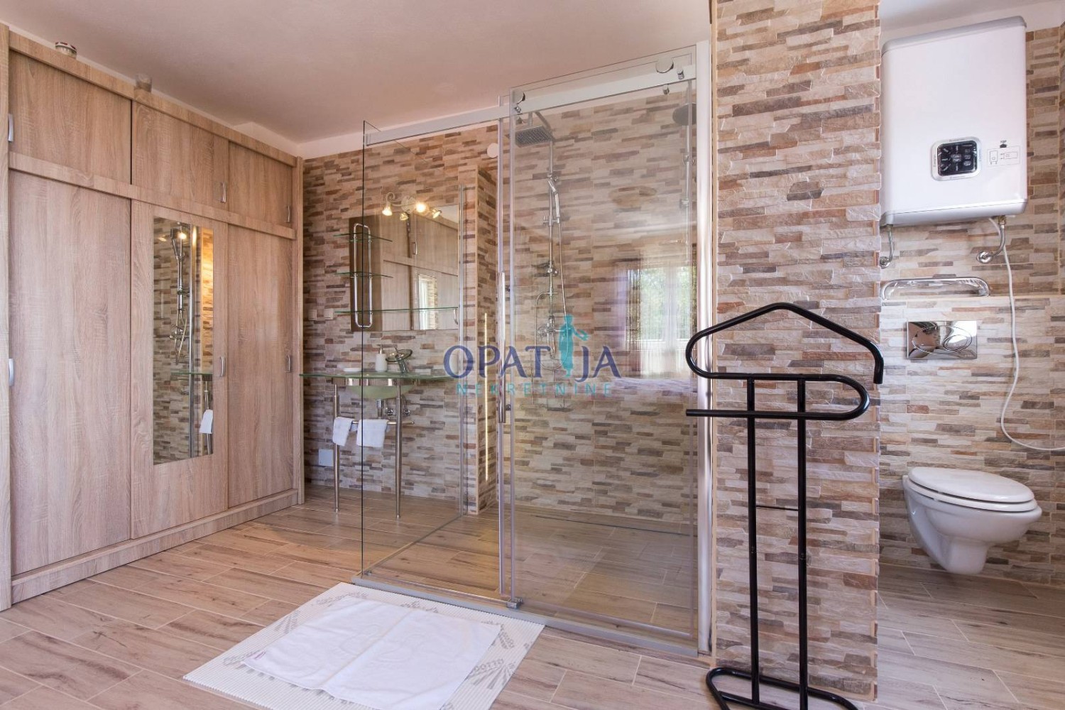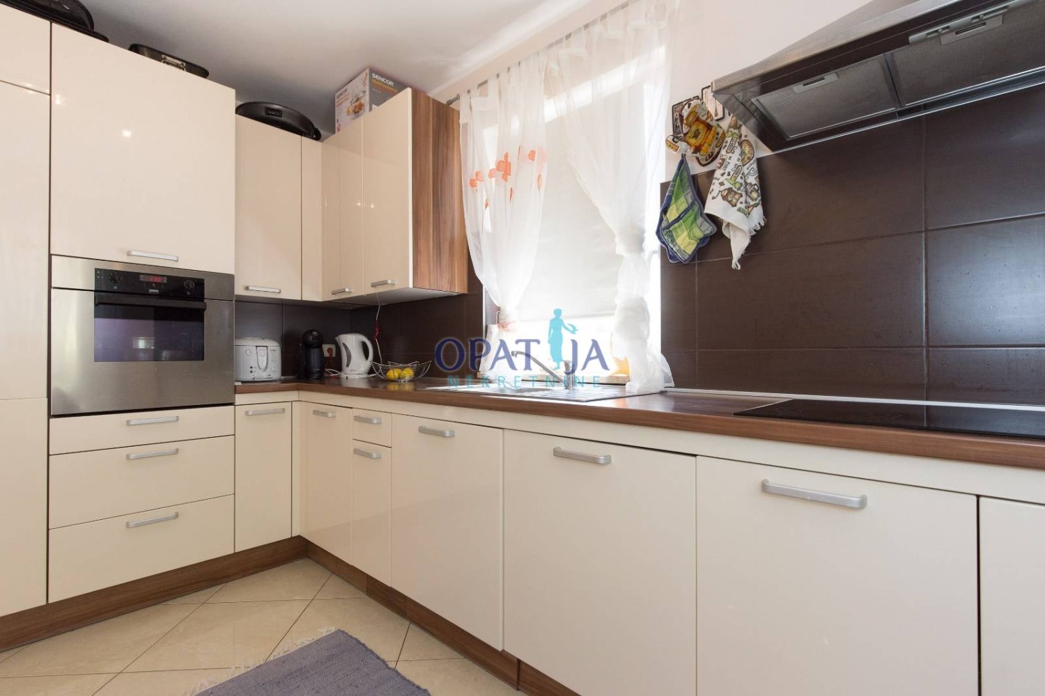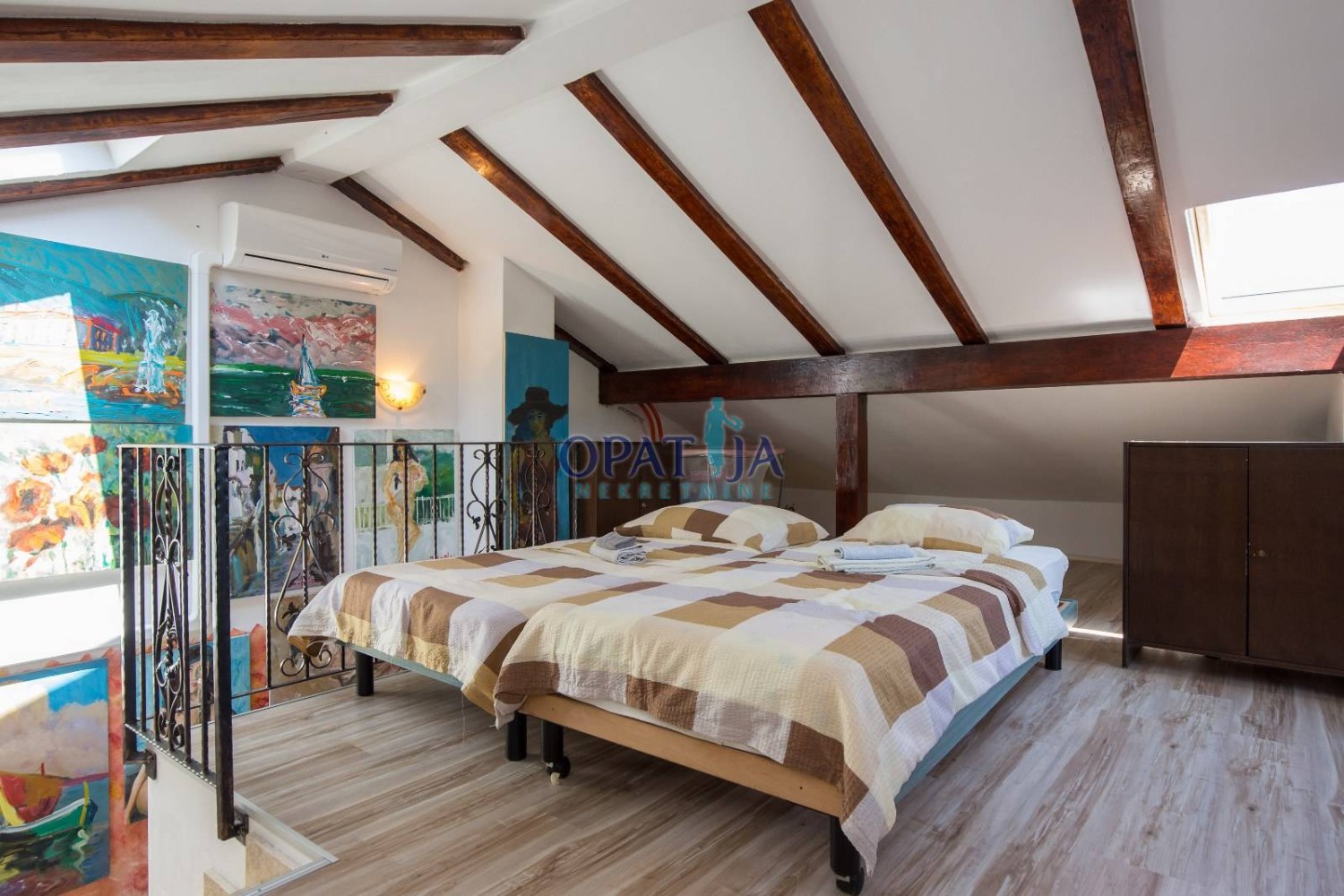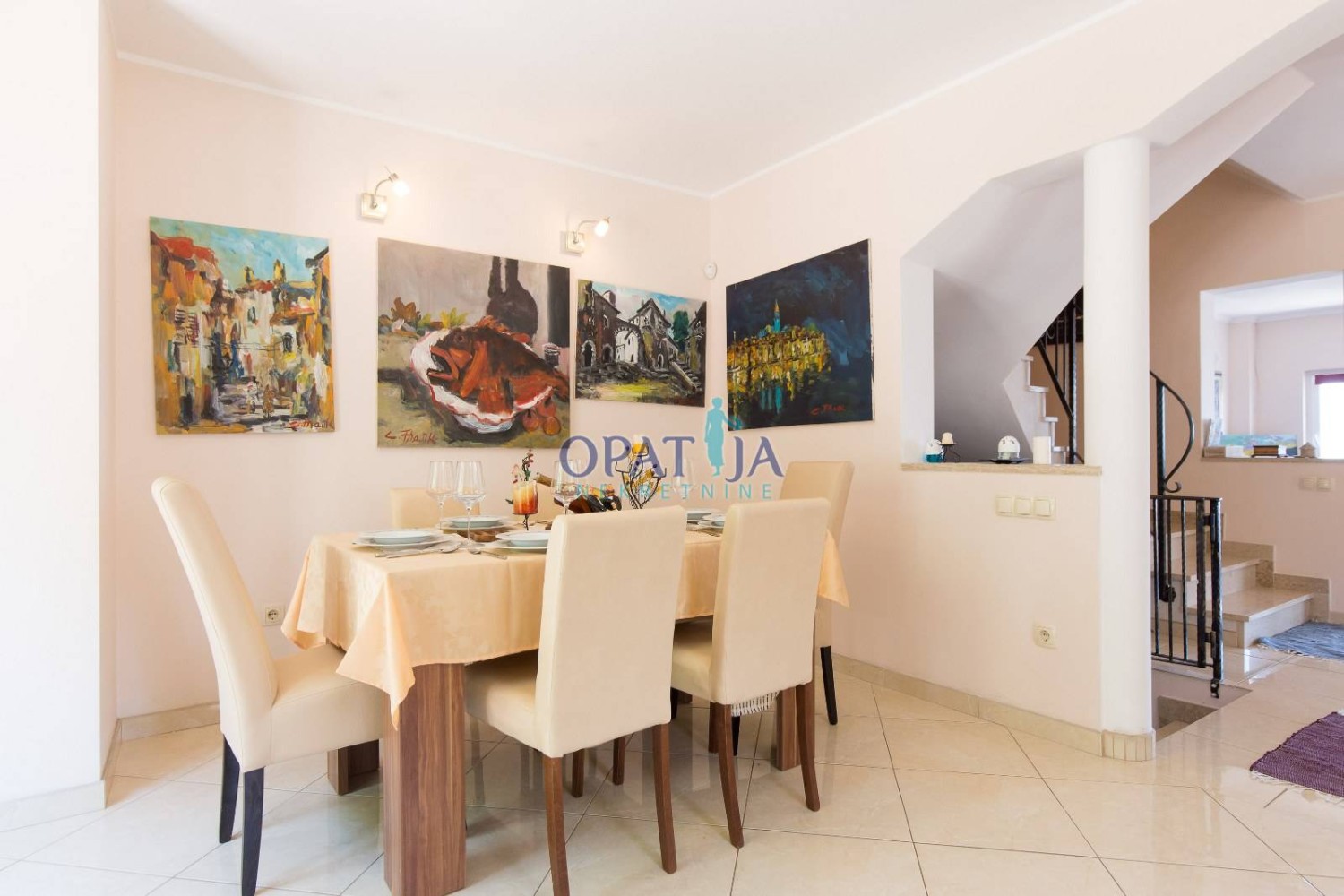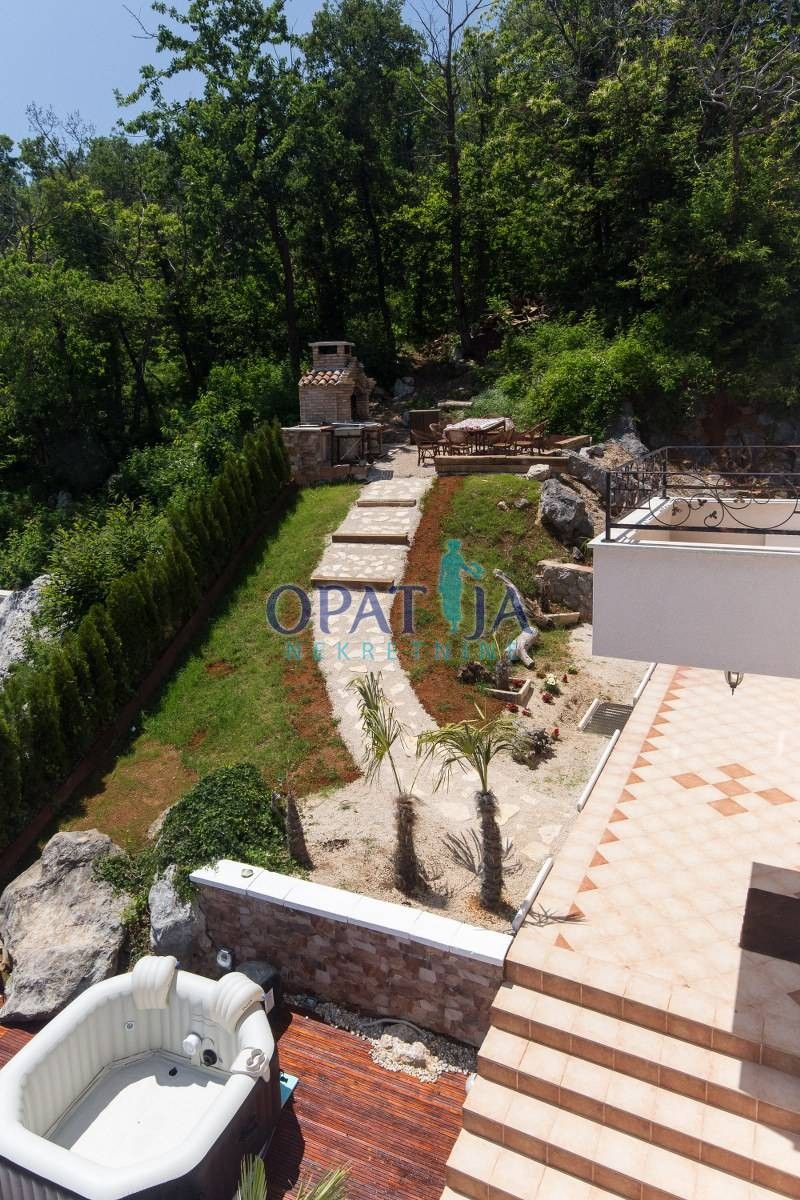 Na prvom katu veliki dnevni boravak, kuhinja i blagavaona. Iz dnevnog se izlazi na terasu koja ima panoramski pogled na Kvarner.
