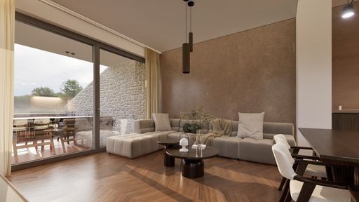 Al piano terra si troveranno l'ingresso, una camera da letto, un bagno, un corridoio, una cucina con zona pranzo e un soggiorno, oltre a una terrazza. Il soggiorno avrà una parete vetrata di 5 metri.