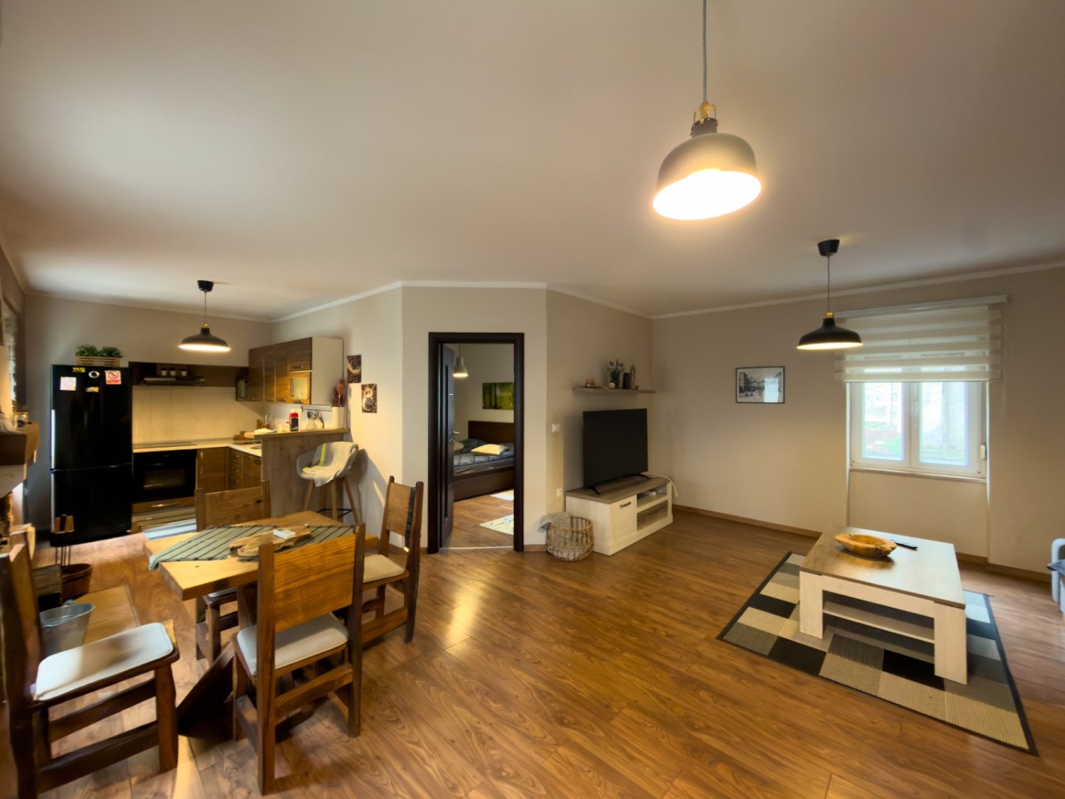 È composto da un ingresso, un soggiorno con cucina e zona pranzo, una camera da letto e un bagno.