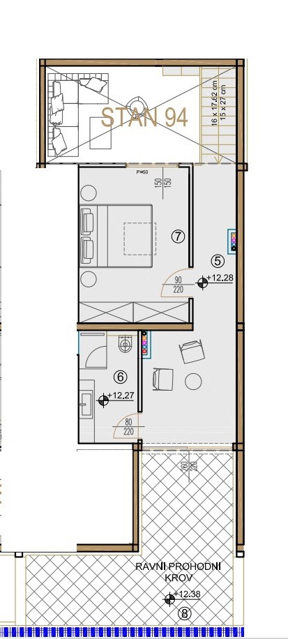 L'appartamento su due piani al primo piano ha una camera da letto, una cucina con sala da pranzo, un bagno, un loggiato e una scala che porta al secondo piano; dove si trova un corridoio con scala, un bagno, una camera da letto e una terrazza sul tetto.
