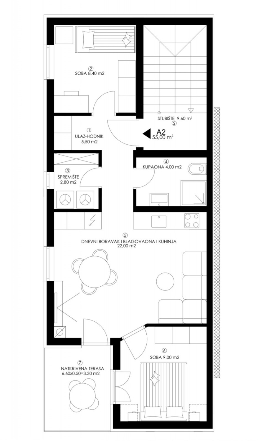 L'appartamento A2 si trova al primo piano dell'edificio e consiste in un corridoio, un bagno, 2 camere da letto, un ripostiglio e una cucina con sala da pranzo e soggiorno che hanno accesso a una terrazza.