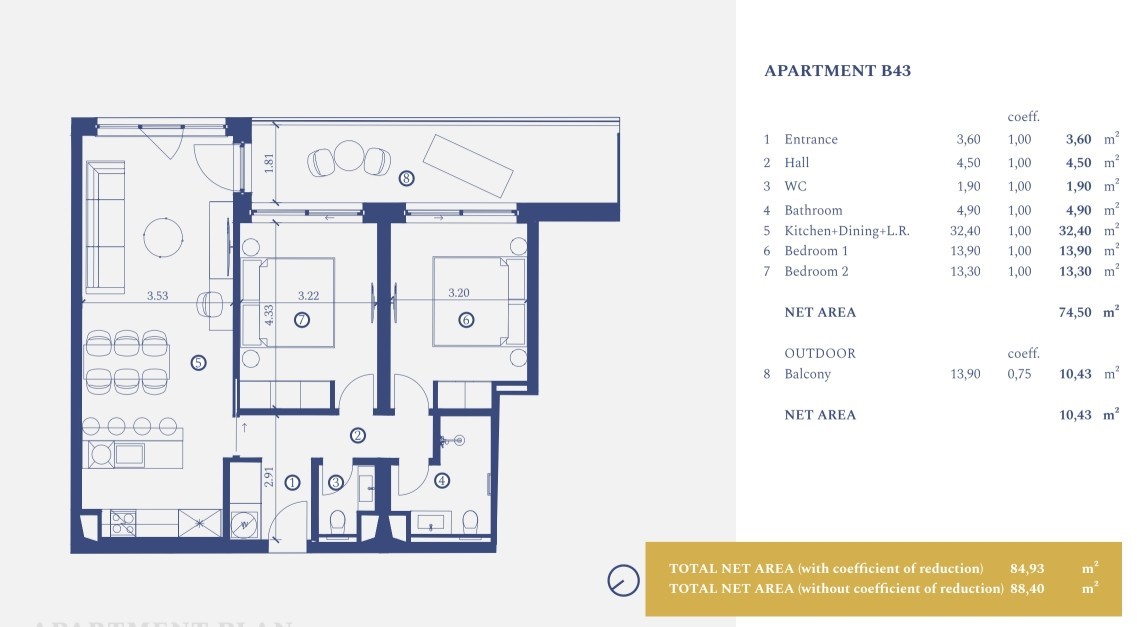 L'appartamento comprende un ingresso, 2 camere da letto, 2 bagni, una cucina, un soggiorno con zona pranzo e un balcone di 10,35 m².