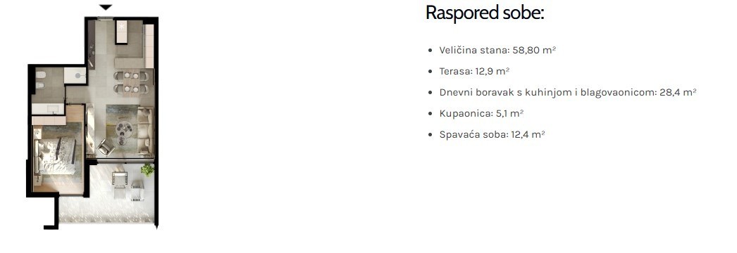 L'appartamento S33, di una superficie totale di 58,80 m², si trova al primo piano dell'edificio e consiste in:
