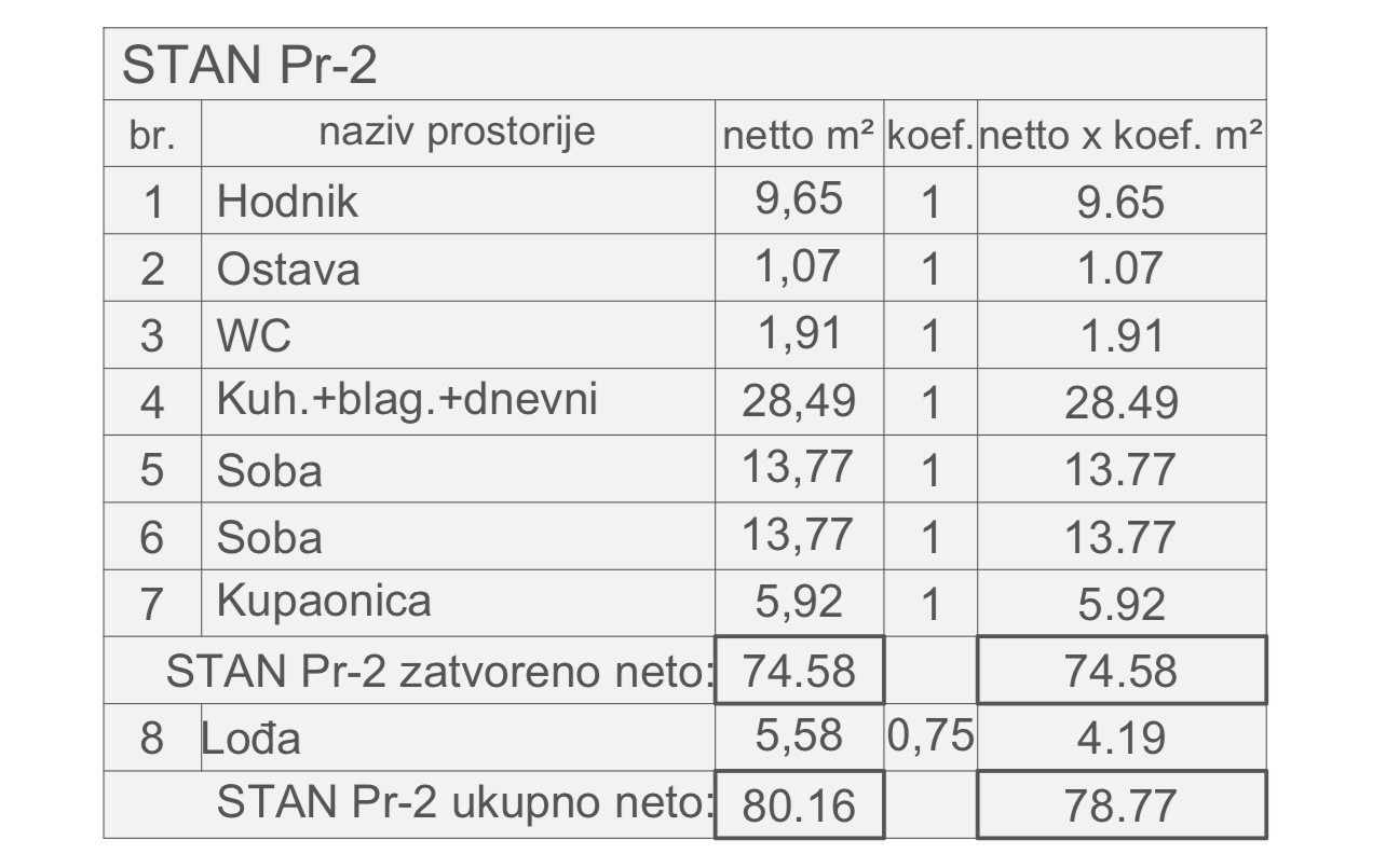L'appartamento S2 si trova al piano terra dell'edificio, con una superficie totale di 80,16 m² (78,77 m²) e consiste in: corridoio, ripostiglio, cucina, soggiorno e sala da pranzo, 2 camere da letto, bagno, wc e loggia.