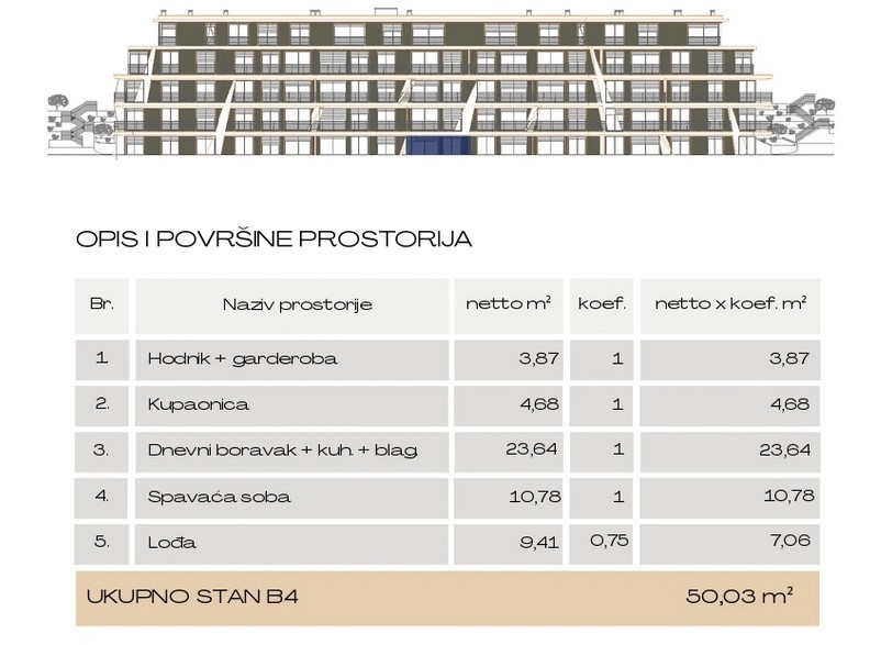 L'appartamento B4, di superficie 51,59 m² (superficie utile netta 50,03 m²), si trova nel condominio B.