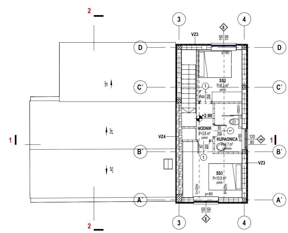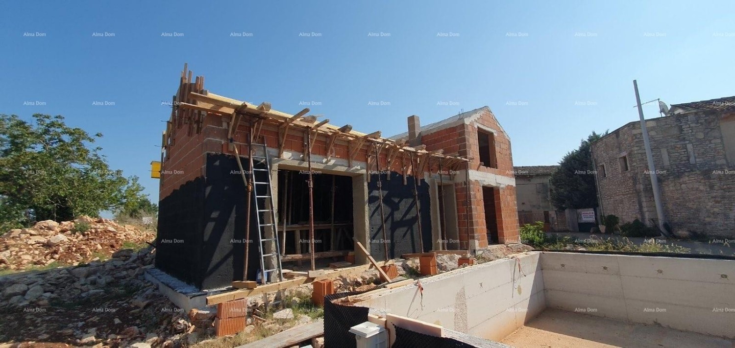 Vodnjan. Casa in costruzione con piscina, situata in una zona tranquilla alla fine del villaggio. La casa è composta da piano terra (soggiorno, sala da pranzo e cucina in open space, una camera da letto, bagno, ripostiglio) e primo piano (due camere da letto e un bagno). La terrazza esterna misura 23 m², mentre la piscina è di 28 m². La casa ha accesso da una strada pubblica e il riscaldamento è previsto tramite una pompa di calore.