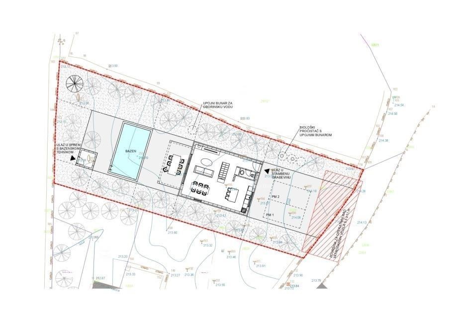 Svetvinčenat. Terreno edificabile di 545 m² con permesso per costruire una casa con piscina. Sul terreno sono previsti una casa con piano terra e primo piano, una piscina esterna, un ripostiglio e due posti auto. Gli allacciamenti per elettricità e acqua sono garantiti.