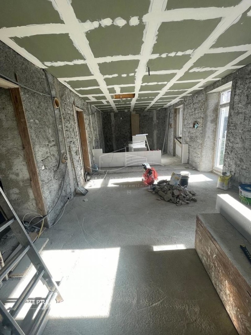 V pritličju stavbe imamo komplet renovirano večje dvosobno stanovanje ( hodnik, kopalnica z wc, večja spalnica, kuhinja z jedilnico in dnevnim prostorom)