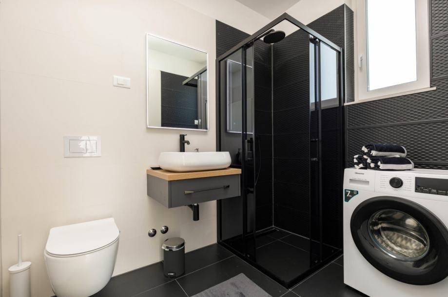 Drugo nadstropje: vhodni del, dve spalnici z ločenima kopalnicama, izhod na prostorno teraso s pripravo za jacuzzi.