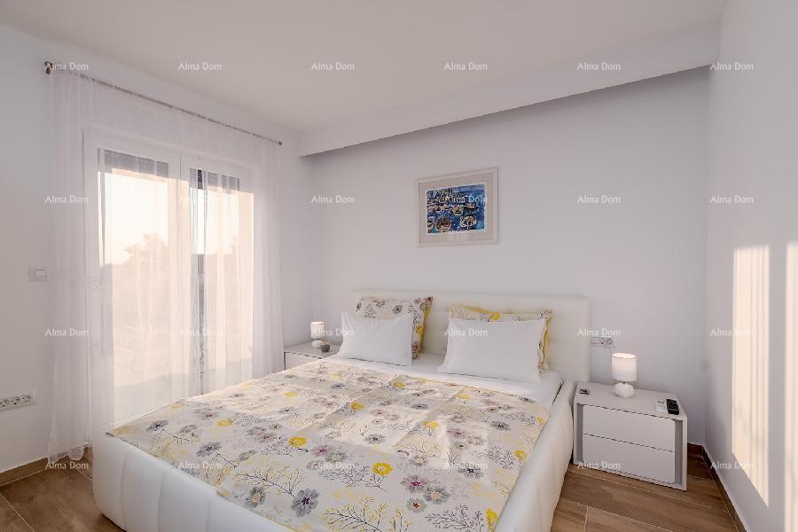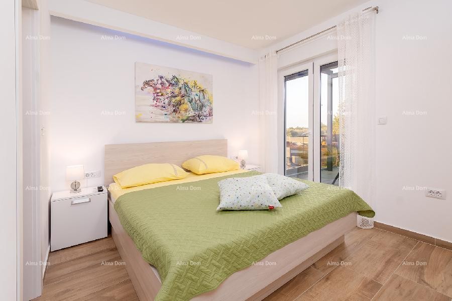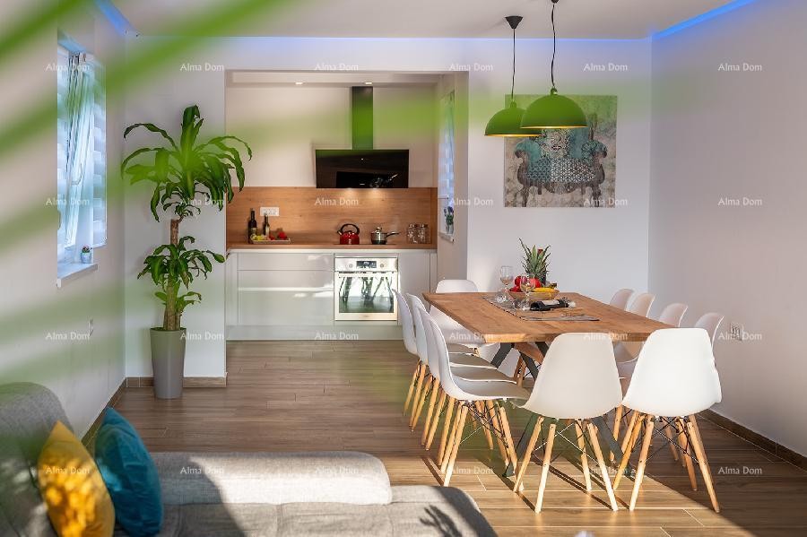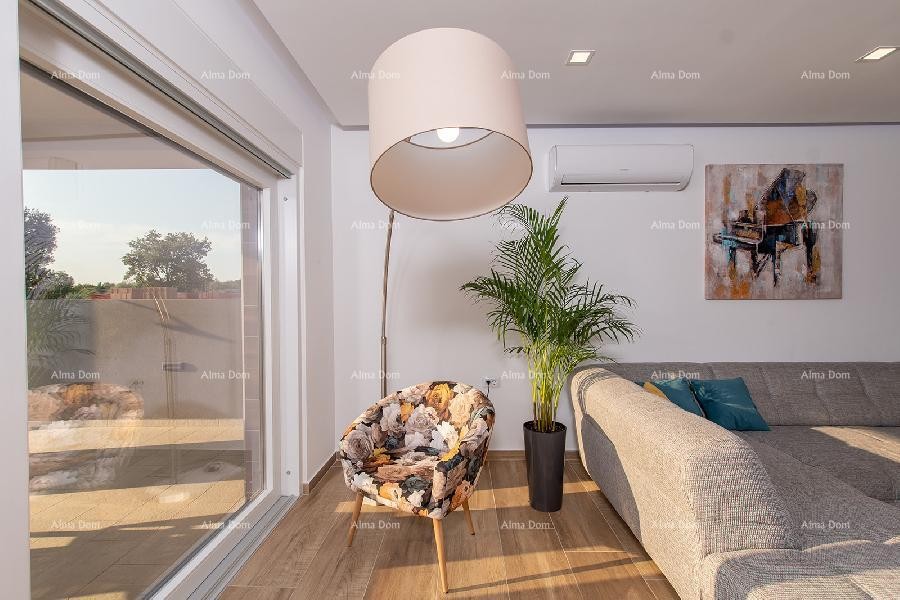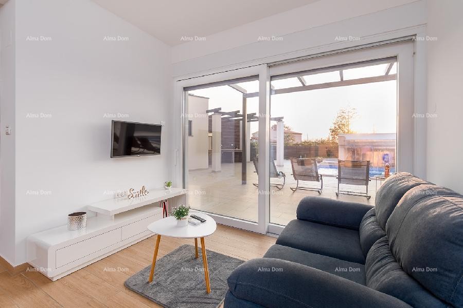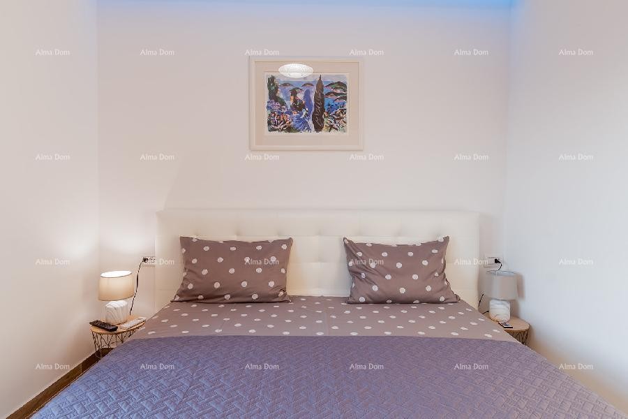 pritličje-dnevna soba in kuhinja, izhod na bazen, kopalnica, v drugem nadstropju pa je spalnica z veliko teraso.